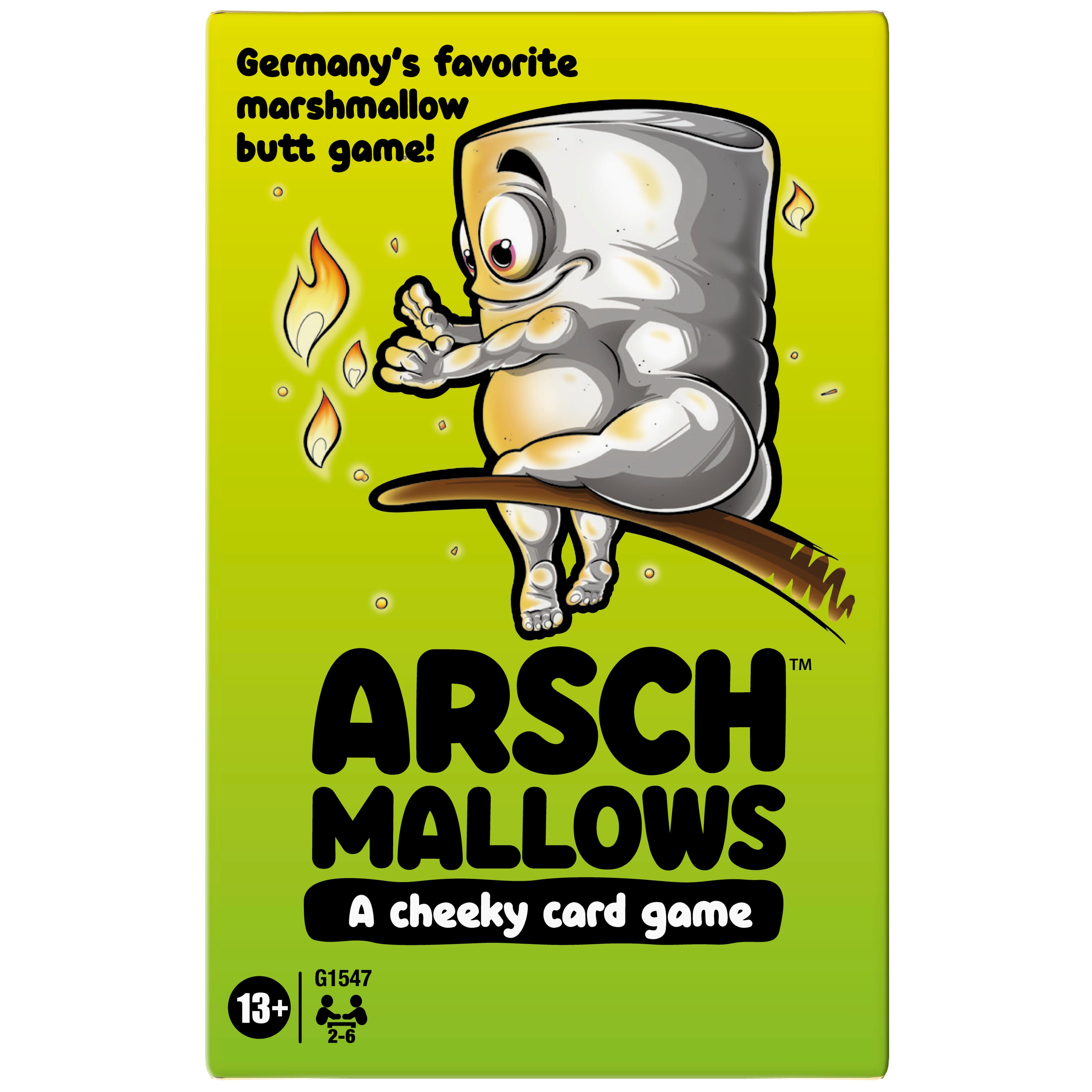 Find out why the Arschmallow game is Germany's favorite marshmallow butt game! In this light strategy card game, the lower the points, the sweeter the score! Collect the cards with the lowest values. Each player starts with 6 facedown cards. They can quickly peek at 2, but the rest are a mystery. Throughout the round, players try to find out what point value is hidden among their cards, as they strategize to get cards with the lowest points. Use Action cards to sabotage friends or gain extra turns. The player with the lowest total value wins the round. And the player with the lowest value at the end of 6 rounds wins the game! Searching for fun party card games for families, adults, and teens? This laugh-out-loud indoor game is a tasty choice, and it makes a funny birthday or holiday gift for adults and teens ages 13 and up.