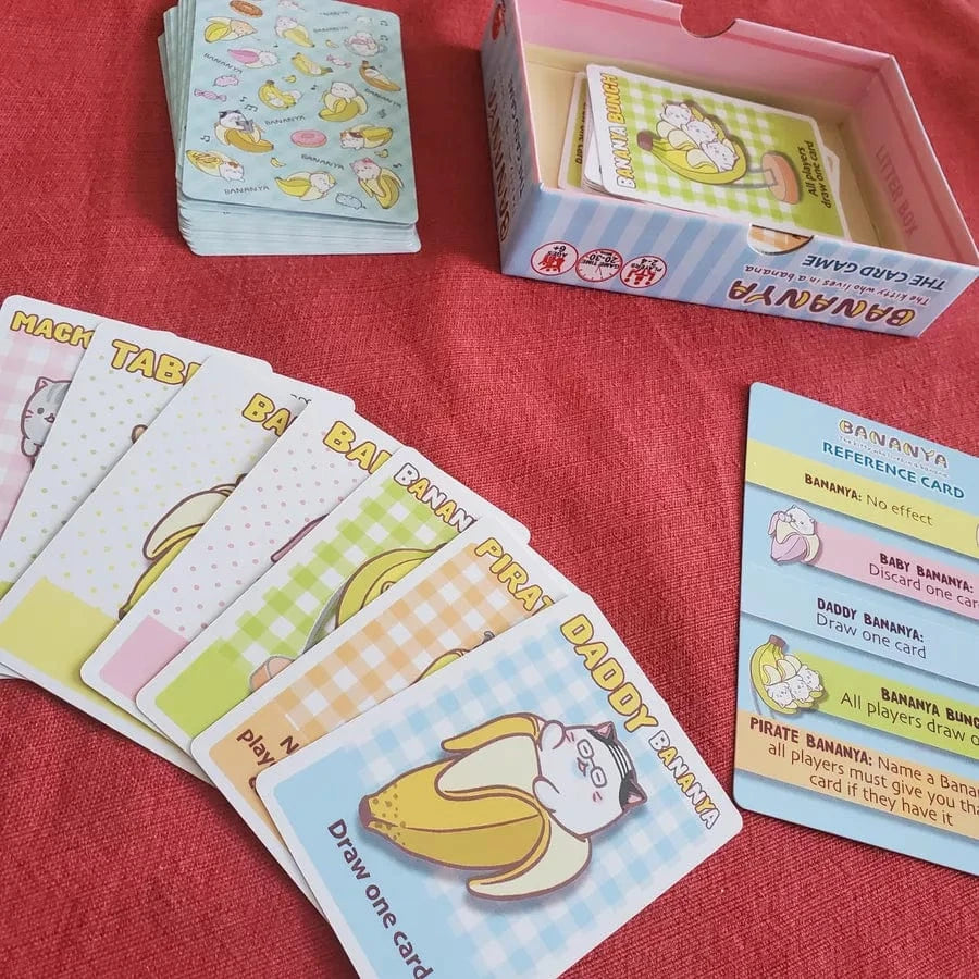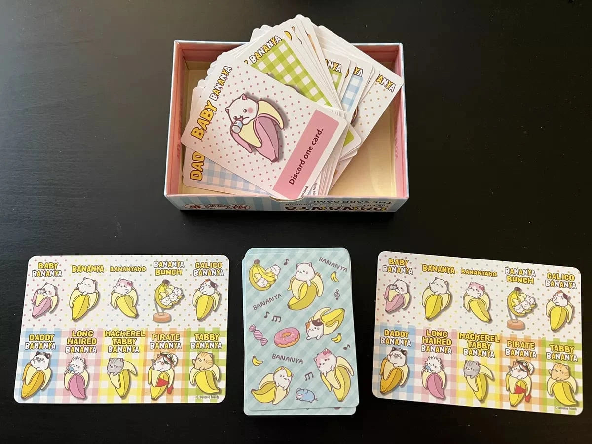 Collect difffferent Bananyas in this cute card game featuring simple set-collection mechanics. Two to Four players compete to collect full sets of Bananya kitties. Players draw cards, play cards to resolve their effects, and force your opponents to put cards in the litterbox - the first player to get all 10 Bananyas of the same type wins the game - but only if they shout "Nya!" first!