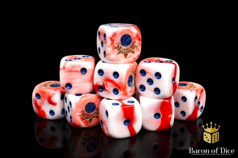 These contain a base of [once] noble whites swirled with dark, dried, bloody hues and inlaid with a two-toned dark blue and rusted brass; resin 16mm dice.  The symbols are on the 6 side. These dice have an option of round or square corner, choose wisely!  Our premium dice now come in a unique reusable tin. Consider the 8 count for Blessing of Blood rolls!