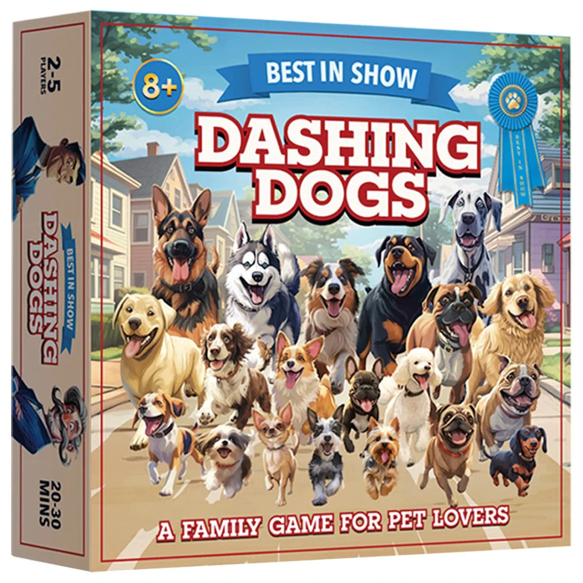 Best in Show Dashing Dogs is a fun, sustainable and inclusive family game built for 2-5 players. Players choose 3 dogs from the top 30 dog breeds and prepare them for the upcoming dog show by collecting 4 tokens for Discipline, training, grooming and and an show entry. Once one of the players has successfully trained all 3 of their dogs, it's time for all completed dogs to enter the show and perform for the judges! In the show round of the game, players collect points cards and wild cards. Points cards will earn judges points for your dogs while Wild cards can award bonus points or cause mishaps for you or your opponents! Collect the most points and win the blue ribbon!