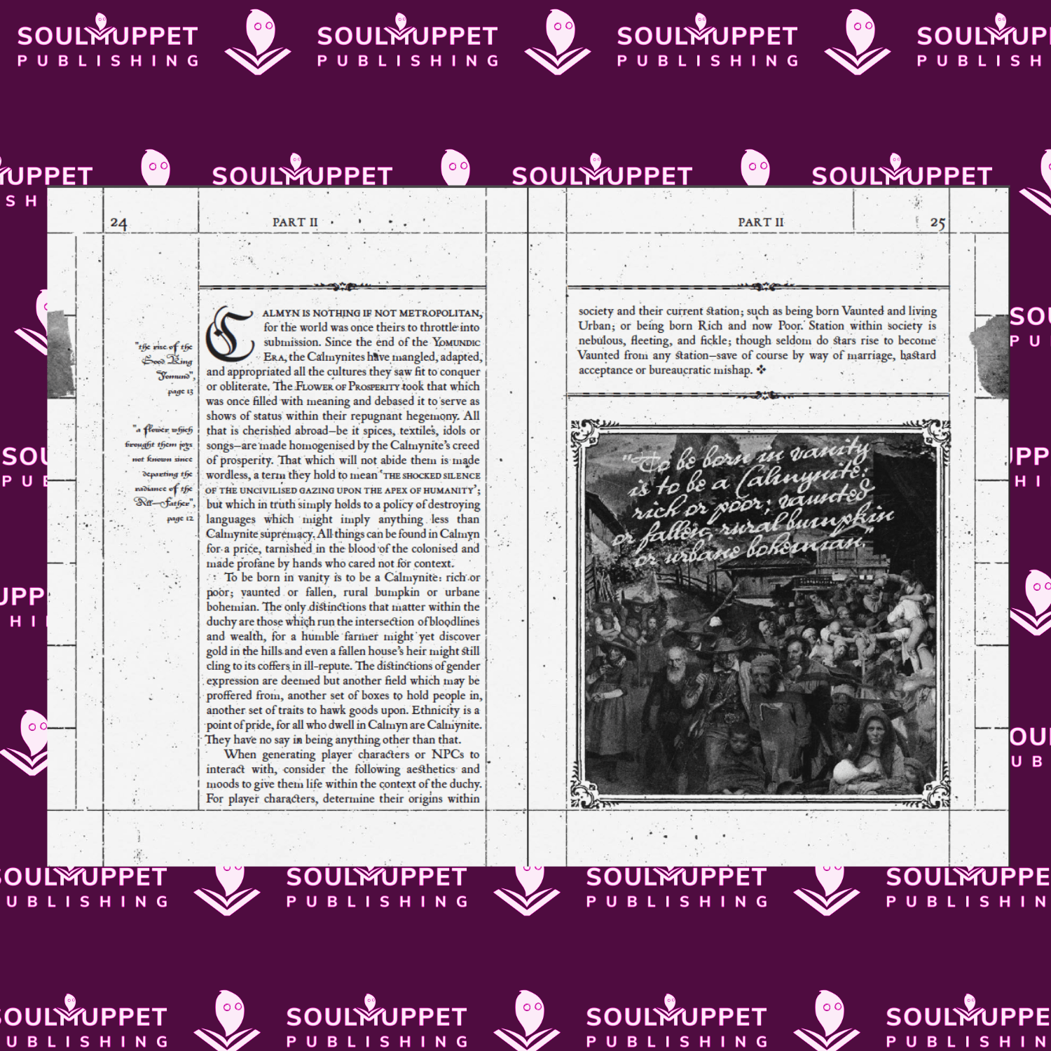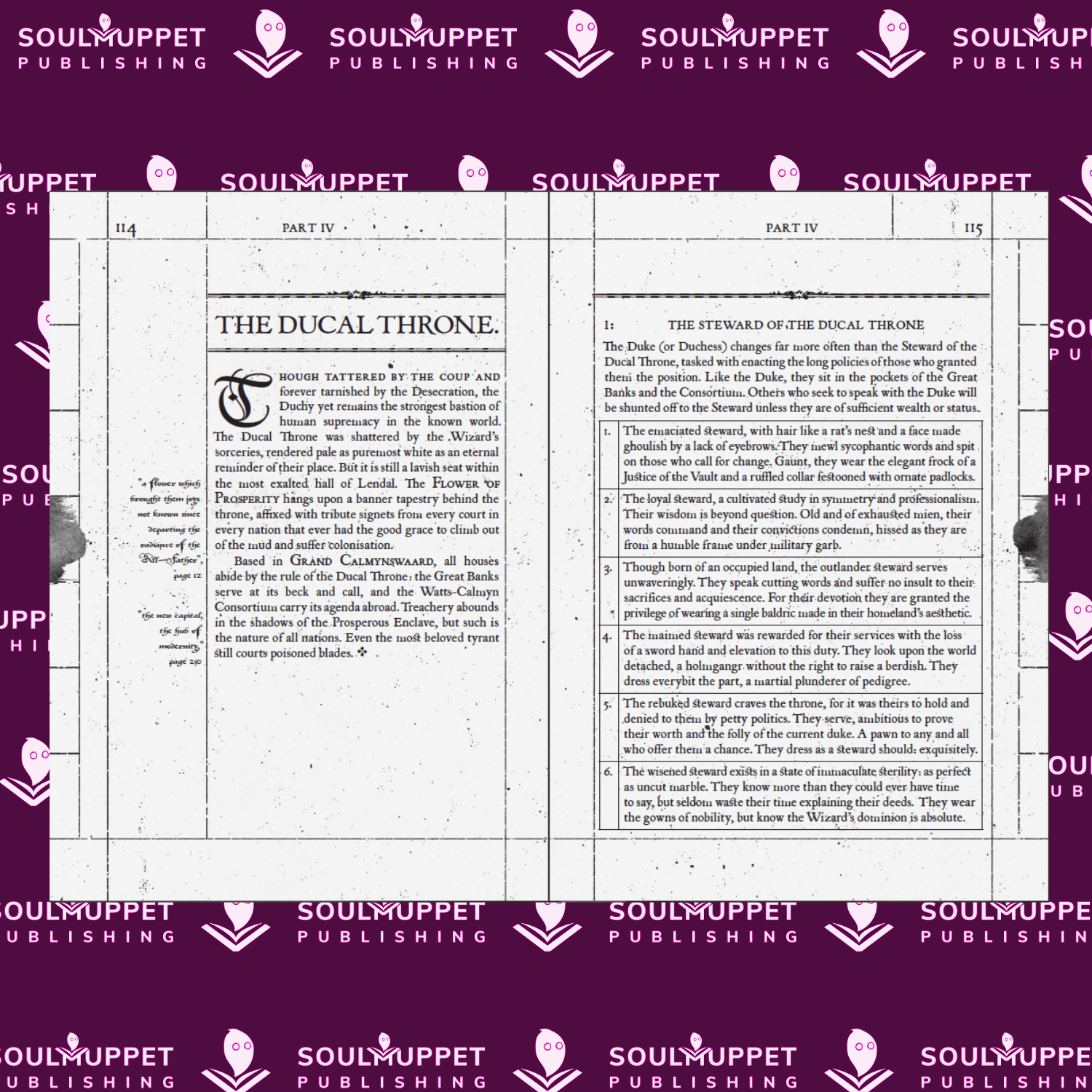 Included within is a massive array of tools and tables for biomes, settlements, and all manner of factions both famed and feared - from well-known Cryptdigging Companies, predatory Ducal Bureaus, to Consortium subsidiaries with their tendrils across the known world and the despairing rebellions which would struggle against these bleak ambitions.