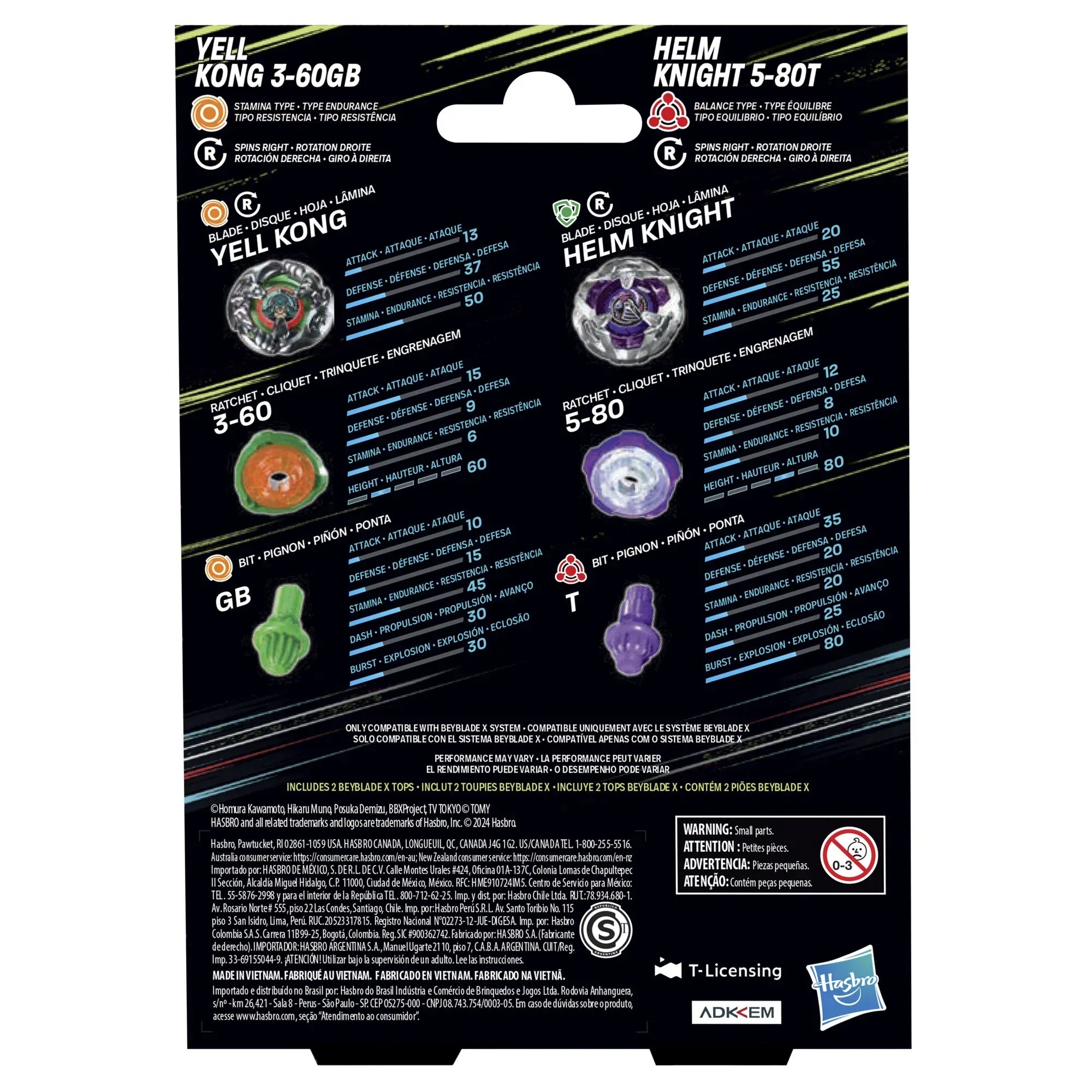 Experience the thrill of the next generation of Beyblade stadiums, launchers and tops: Beyblade X with the Beyblade X Yell Kong 3-60GB and Helm Knight 5-80T Dual Pack Set which includes 2 right-spinning tops (Beystadium and launchers required, sold separately). Launch right into battle or reconfigure the interchangeable blade, ratchet, and bit of this Dual Pack with those of other Beyblade X tops (sold separately) to create your own unsurpassable Bey. Beyblade X features the X-Celerator Gear System innovation to level-up your game. When the gear of a Beyblade X top engages the rail of the Beystadium arena, it can super-accelerate into an Xtreme Dash rocketing it around the stadium for crushing collisions and epic bursts. Bladers launch their tops into fierce clashes against their opponent’s scoring points with each confrontation – first to score 4 points wins. Hasbro Beyblade toys with authentic Takara Tomy die-cast metal tops make great kids gifts for boys and girls ages 8 and up. HASBRO and all related trademarks and logos are trademarks of Hasbro, Inc. Includes: 2 Beyblade X Tops Ages 8 and up Warning: Choking Hazard -- Small parts. Not for children under 3 years. Warning: Only use BEYBLADE X tops with a BEYBLADE X Beystadium. DO NOT LEAN OVER STADIUM when tops are in play. Do not use stadium on tables or other elevated surfaces. Tops may bounce up and hit eye and face. Parents: Check apps.hasbro.com for app availability, operating systems and device compatibility, and updates. Fees may apply. Requires Beyblade X Beystadium and launchers to play. © 2024 Hasbro. All Rights Reserved. ©Homura Kawamoto, Hikaru Muno, Posuka Demizu, BBXProject, TV TOKYO © TOMY Apple and the Apple logo are trademarks of Apple Inc., registered in the U.S. and other countries. App Store is a service mark of Apple Inc. Google Play and the Google Play logo are trademarks of Google LLC.
