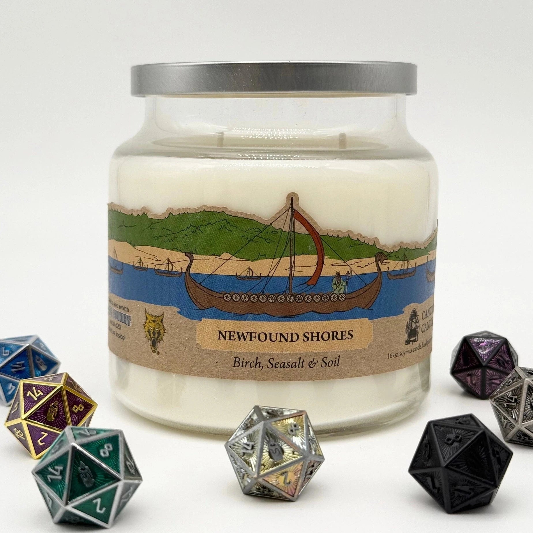 Set sail for adventure with Newfound Shores RPG Candle, a collaboration with Norse Foundry that captures the essence of uncharted lands and daring discoveries. This 16 oz. soy wax candle fills your space with the crisp, invigorating scent of birch, sea salt, and soil, evoking the feeling of stepping onto fresh shores after a long voyage across the sea. But treasure awaits—each candle contains a hidden D20, ready to be unearthed. Will you roll a Common, Uncommon, Rare, or Ultra-Rare die? Light the wick, breathe in the salty air, and embrace the call of the unknown! This 16 oz. candle is double wicked for a clean, even burn. The candle's burn time is approximately 60 hours and is capable of filling a large area. To top it all off, they cast a romantic glow on the table as the flame flickers through beautiful glass. Made with 100% Soy Wax and poured in small batches in Los Angeles, California.