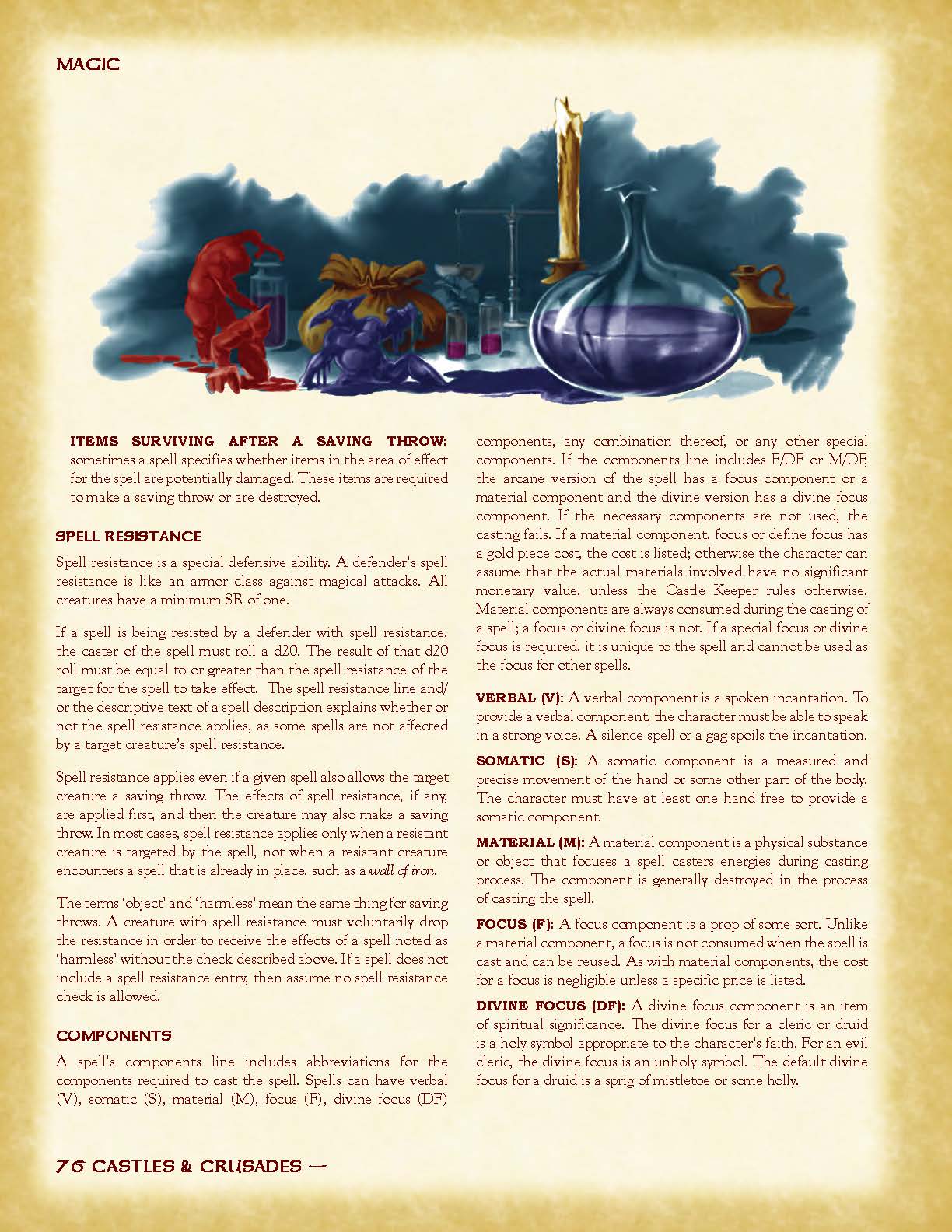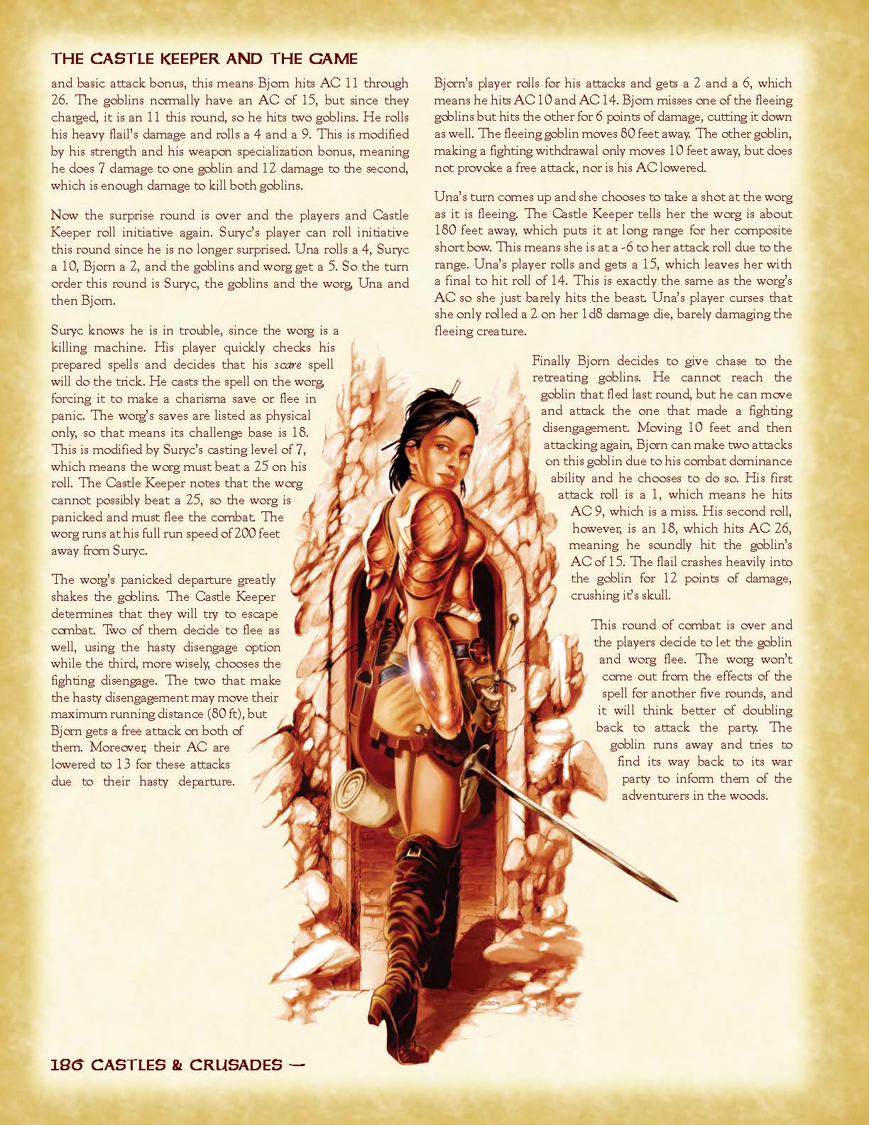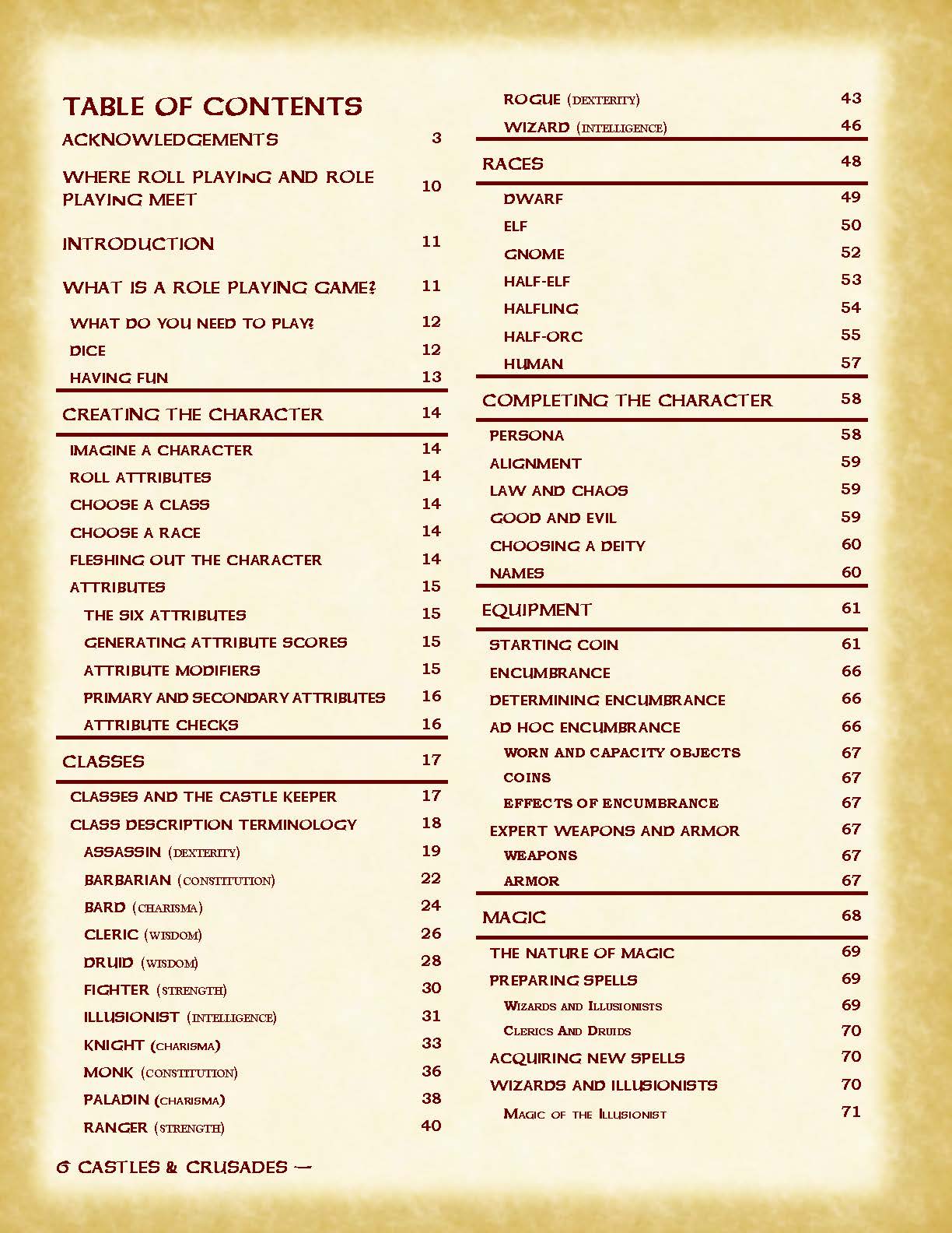 The RPG: In the opening pages, we explain the tools you will need and how to play a game of Castles & Crusades. We explain the basics of the attribute check system, the Siege Engine, and touch on attribute modifiers and attribute checks.