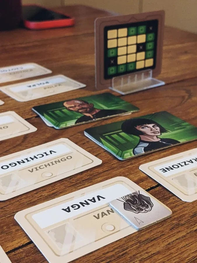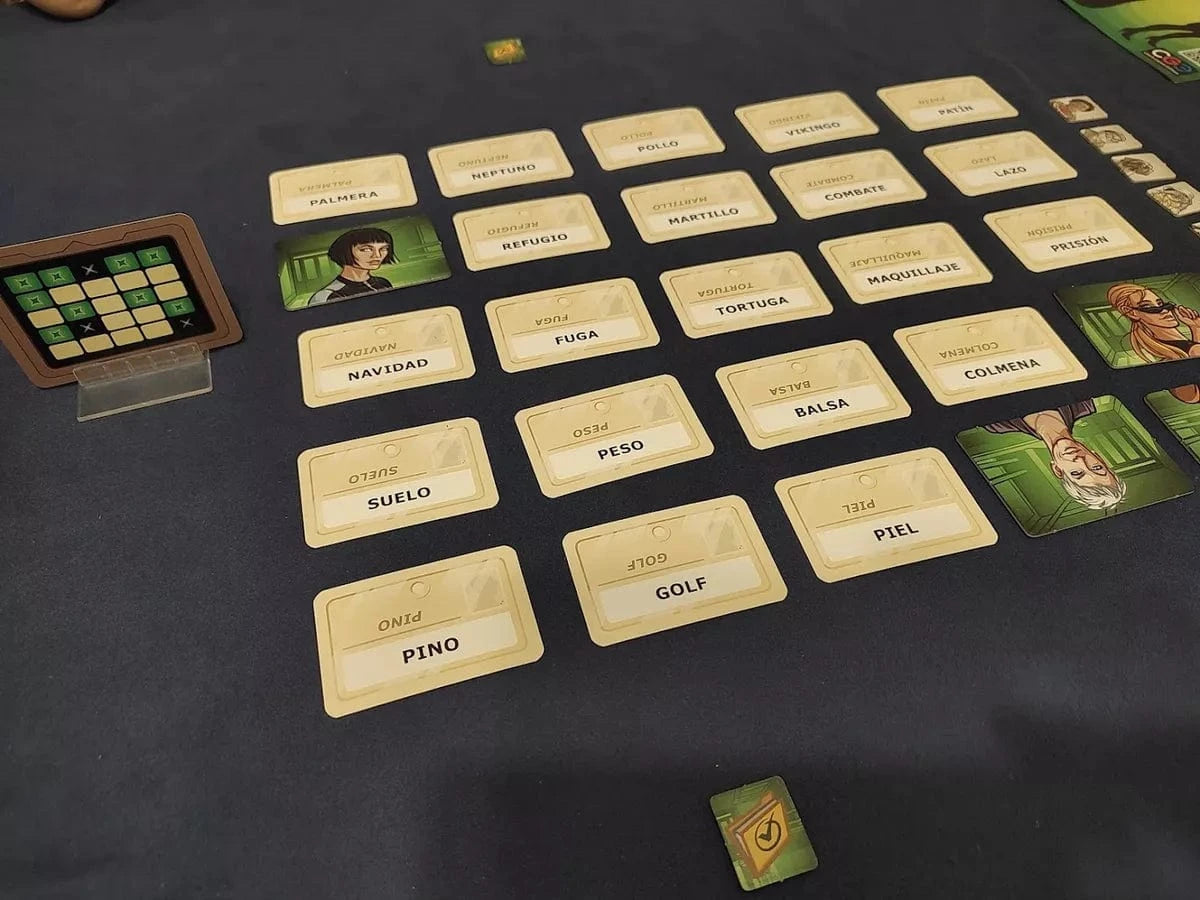Collectively, you need to reveal all fifteen agents — without revealing an assassin — before time runs out in order to win the game. Either player can decide to give the first one-word clue to the other player, along with a number. Whoever receives the clue places a finger on a card to identify that agent. If correct, they can attempt to identify another one. If they identify a bystander, then their guessing time ends. If they identify an assassin, you both lose! Unlike regular Codenames, they can keep guessing as long as they keep identifying an agent each time; this is useful for going back to previous clues and finding ones they missed earlier. After the first clue is given, players alternate giving clues.