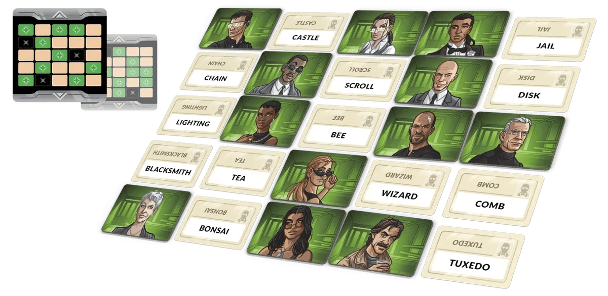 To set up play, lay out 25 word cards in a 5×5 grid. Place a key card in the holder so that each player sees one side of the card. Each player sees a 5×5 grid on the card, with nine of the squares colored green (representing your agents) and three squares colored black (representing assassins). Three of the nine squares on each side are also green on the other side, one assassin is black on both sides, one is green on the other side and the other is an innocent bystander on the other side.
