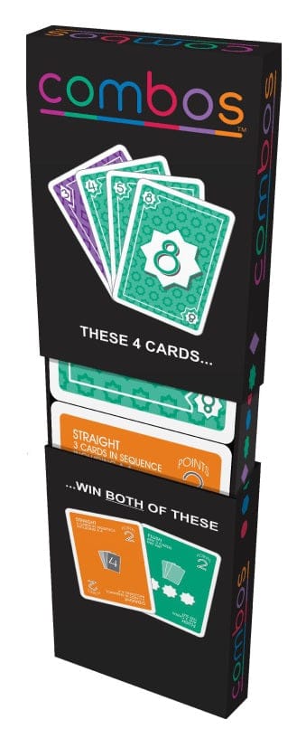 In Combos, there are 5 Combo cards on the table. Each describes a combination, such as "3-card straight", "two-pair", "4-card flush", and so on. The first player to make a Combo wins the Combo card and scores the points. A new Combo card is then dealt to replace it. All 28 Combo cards are different, so the game is always changing.