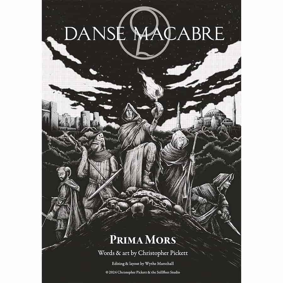 In Danse Macabre by Christopher Pickett and the Stillfleet Studio, you play a Pilgrim, a conscripted peasant, sentenced to traverse the wilderness in pursuit of quintessence—the sole remedy against the curse of undeath. Because in the twilight of the 14th century, death is no longer final: those who die are miraculously and terribly revived, each time with new maleficia—mutations of both the spirit and the flesh. Your journey unfolds alongside a caravan of fellow exiles, united in the quest for artifacts of a bygone era which hold the keys to your—and your city’s—salvation. There is no magic to save you here, only a rich, realistic, historical setting: to complete your quest, you will travel through the intrigue-filled cosmopolitan cities of the medieval Mediterranean, its mutant-infested wildernesses, and the abandoned ruins of its many broken kingdoms, Christian and Muslim alike. Danse Macabre: Prima Mors includes a full early version of the game, which is currently in development and being actively playtested. This OSR-adjacent book is 64 pages long and features: complete rules; 6 backgrounds (classes, including Archer, Mendicant, and more); 20 maleficia (wild body-horror mutations); Full lists of equipment (weapons, armor, useful medieval travel gear; a beautiful written introduction to the game-world (which is a twisted shadow of our own in 1390 CE); an introductory quest; an ornamental character sheet; and amazing art (all #HumanMade by the author!).