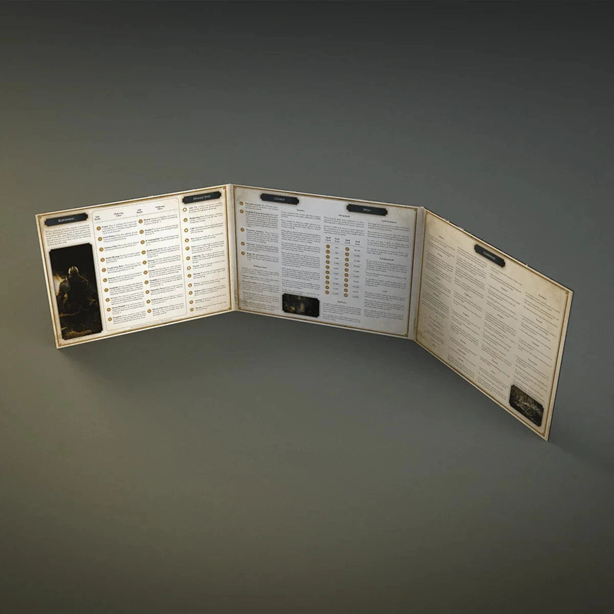 Support your players through their many trials and tribulations in Dark Souls™: The Roleplaying Game with this 3 panel, matte laminate GM Screen (reaching over 60cm in width when fully unfolded!). Equipped with key rules, reference tables, and other useful aids in an easy-to-reach format, this screen will help you induct players into the punishing but rewarding world of the tabletop Dark Souls™ RPG. The side your players will see is decorated with lavish illustrations from the Dark Souls™ universe.