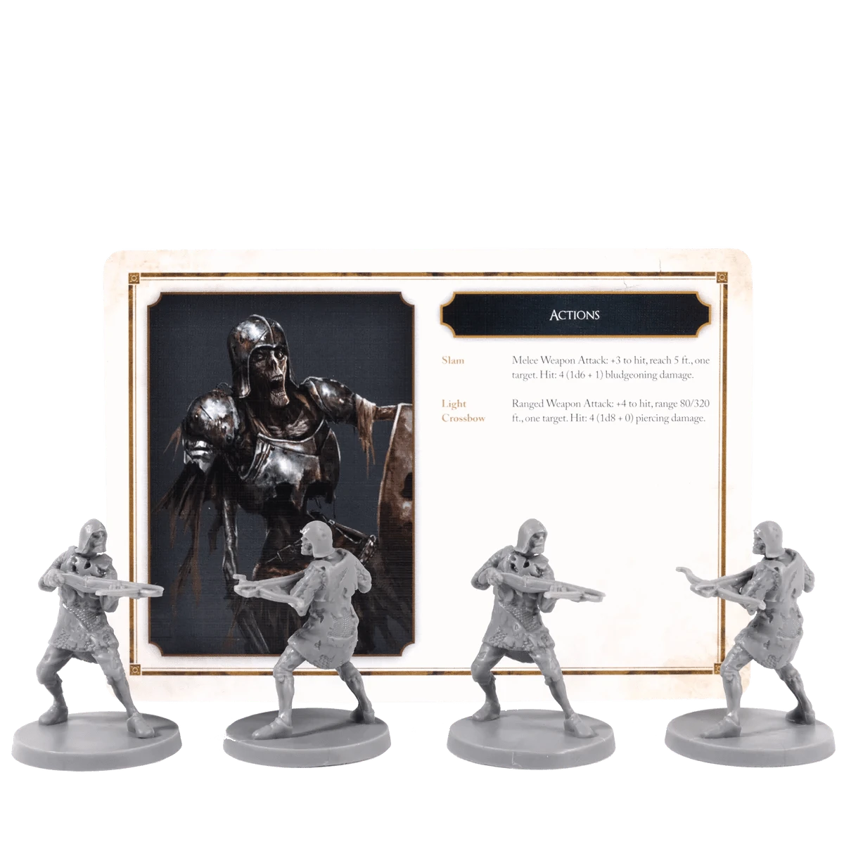 Inside this box is everything you need to add the decrepit Hollow Crossbowmen to your campaigns, including 4 highly detailed minis and a stat card. All miniatures from this range are 5e-compatible, and ready to add to any roleplaying campaign right from the box.