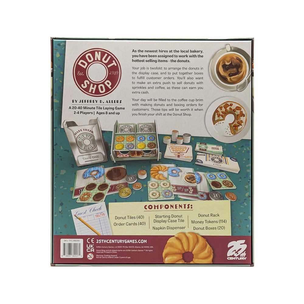 In Donut Shop, players will be taking turns placing Donut Tiles in the Display Case, earning points based on how many donuts of the same type are connected. Players then have the opportunity to box groupings of donuts in the Display Case in order to fulfill customer requests from their Order Cards and earn extra money.