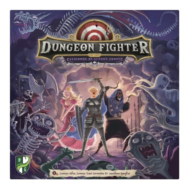 Follow our heroes in the Catacombs of Gloomy Ghosts as they explore a haunted necropolis, trying to avoid meeting a grim fate at the hands of the undead! Featuring fast-rolling d12 dice and a slice-based target board for a spooky Dungeon Fighter challenge!