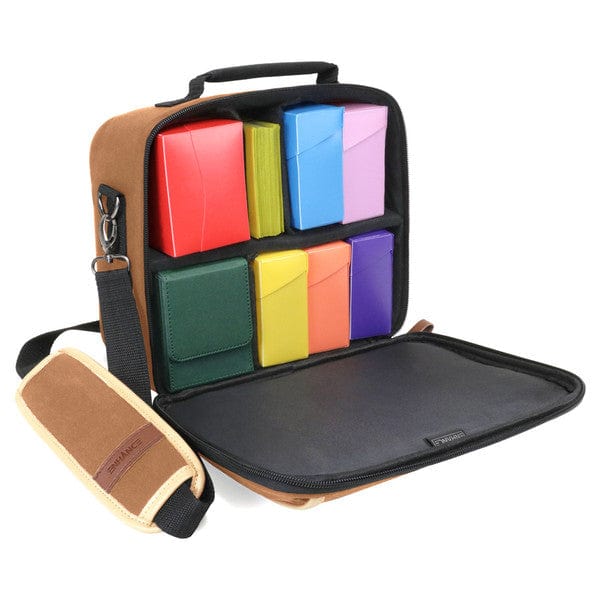 The unique design features a leather ENHANCE emblem, tan leather lining on both exterior of Magic the Gathering Carrying bag, and on the padded shoulder straps.