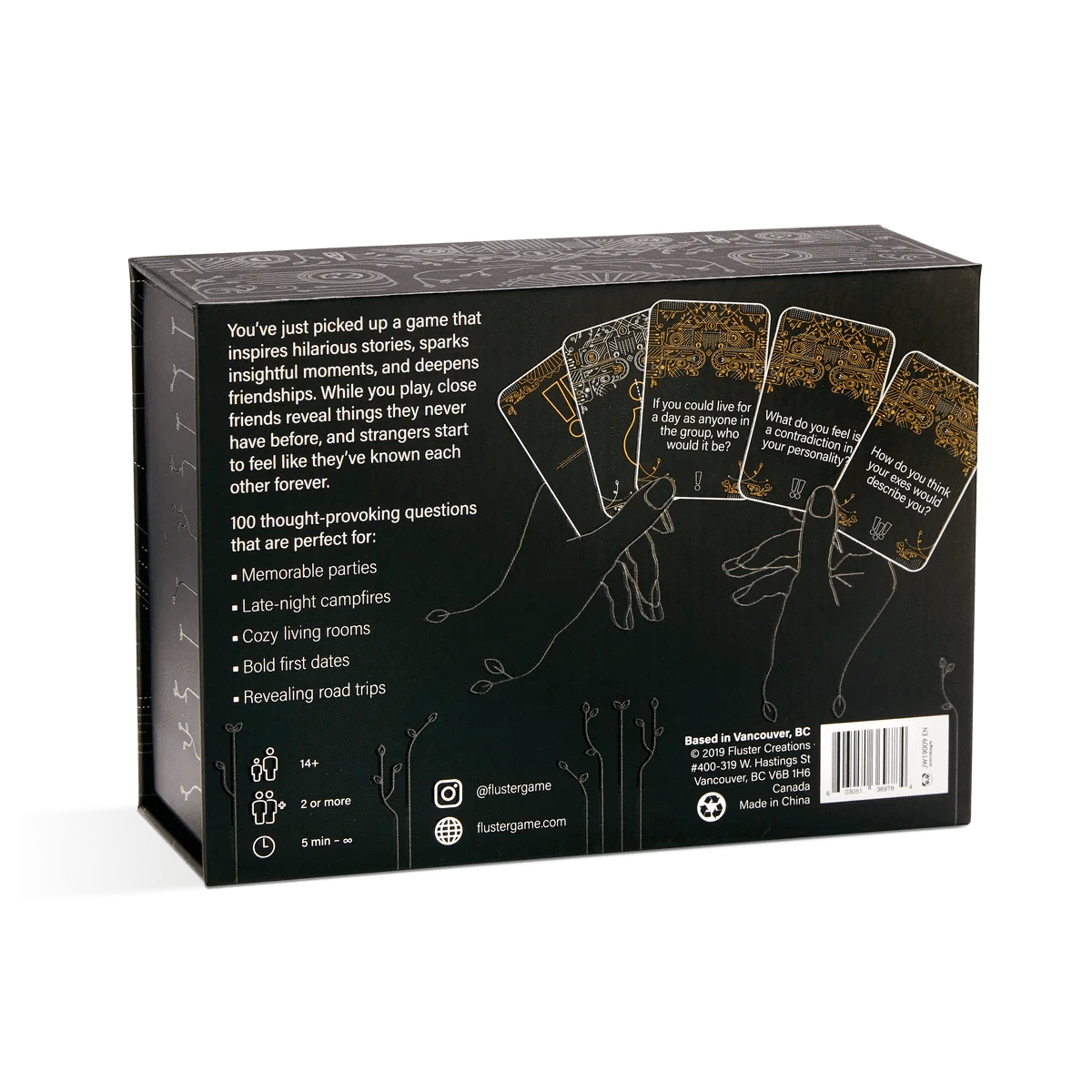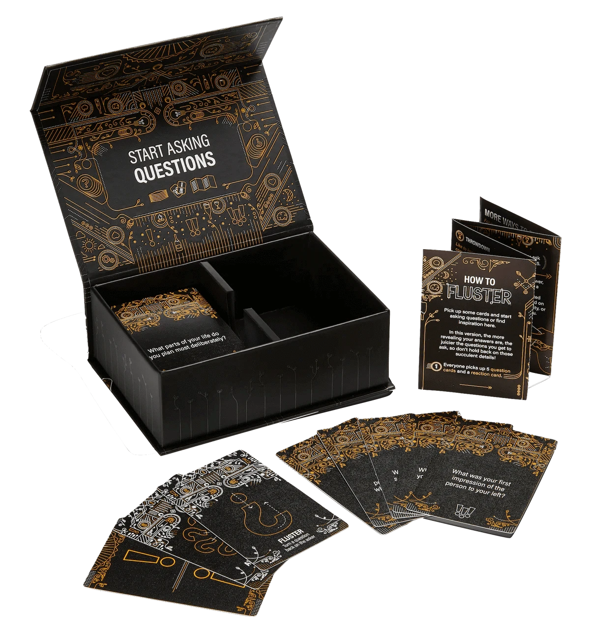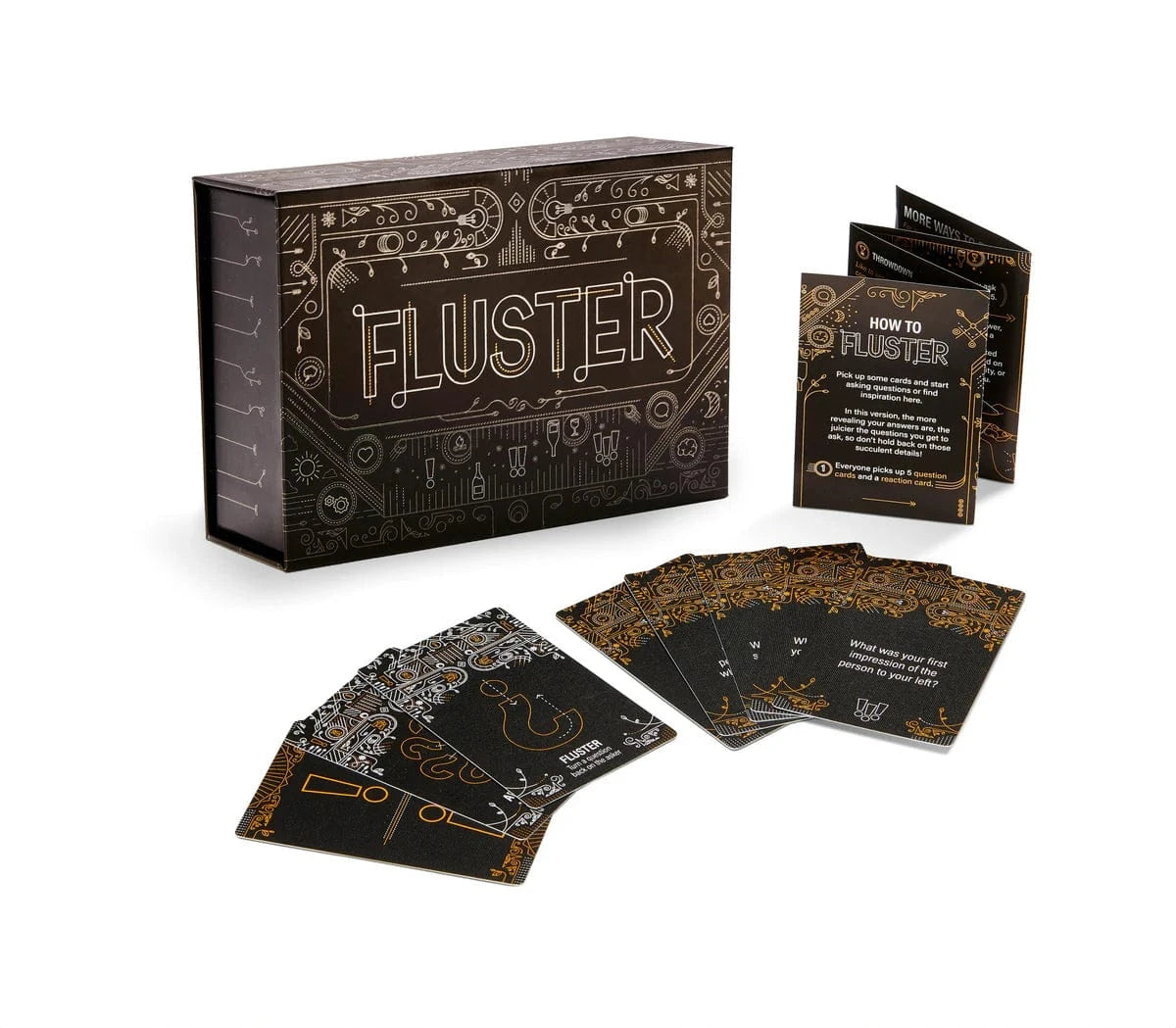 Fluster is the game of unusual questions for deeper connections. It is a social card game built around 100 thought-provoking questions that are carefully crafted to inspire the kind of heartfelt, funny, and revealing conversations that leave people feeling closer to each other.