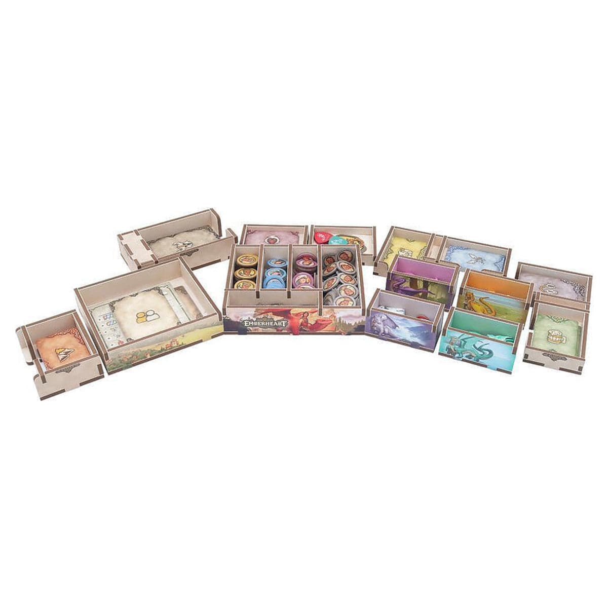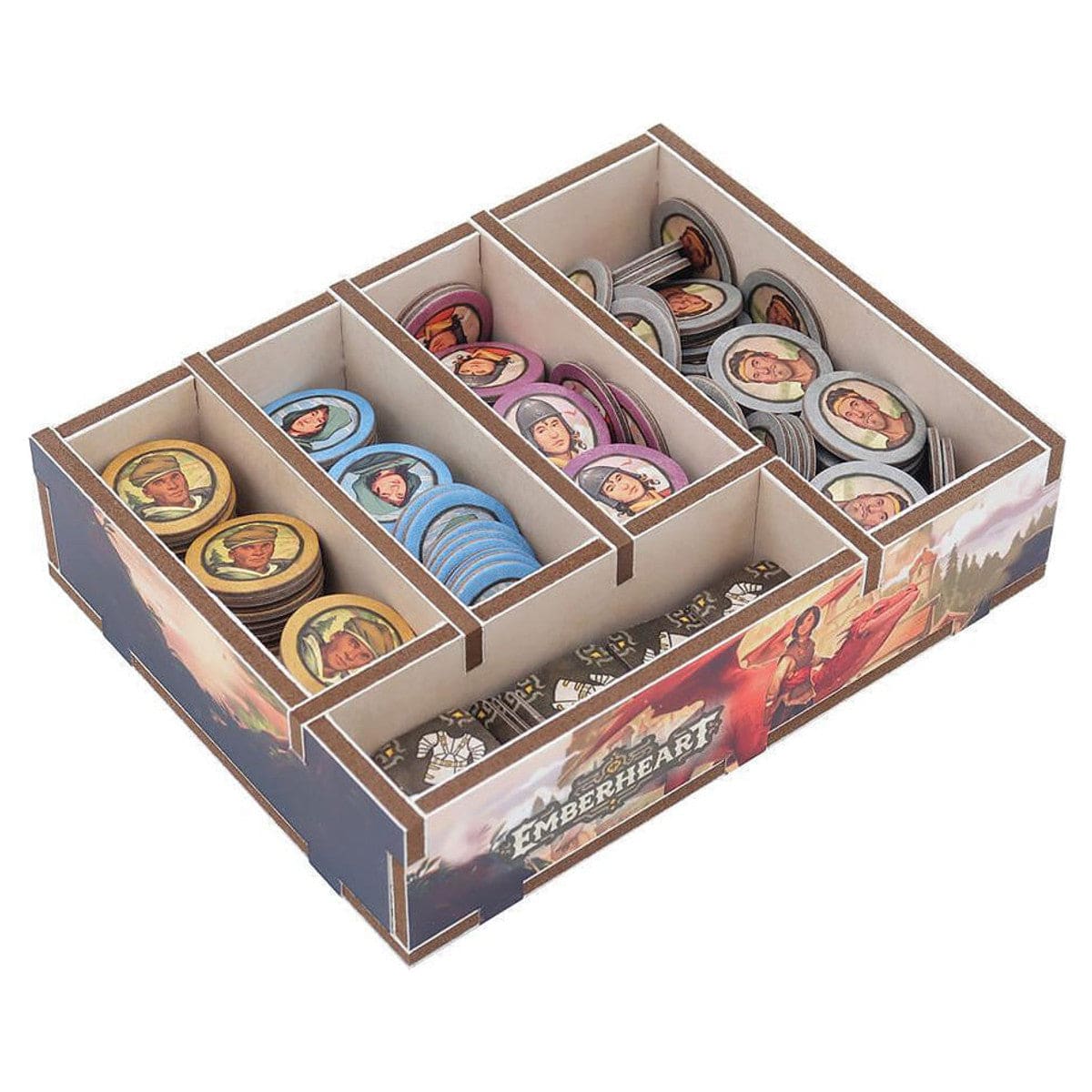 Official full colour insert compatible with Emberheart®. The design provides both efficient storage and improved game play. Many of the trays can be utilised during the game, and they greatly aid set-up and clear-away times. The rules and boards act as a lid on top of the trays. The full colour print really brings the trays to life, tying them in with the theme of the game and making it easier to see which components go where.