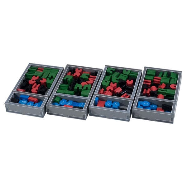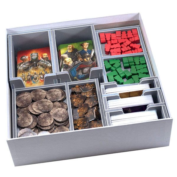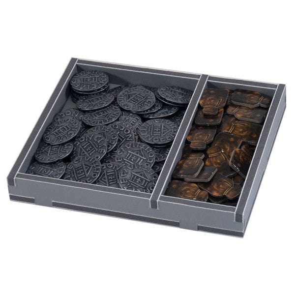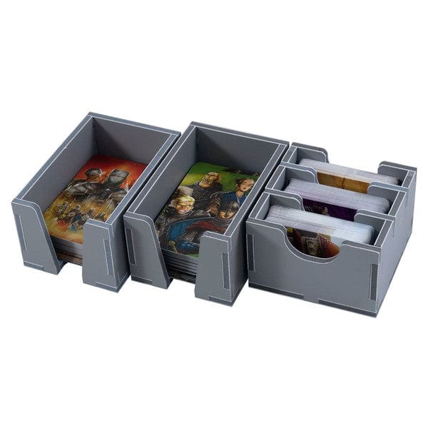 Insert compatible with Paladins of the West Kingdom® . The design provides both efficient storage and improved game play. Many of the trays can be utilized during the game, and they greatly aid set-up and clear-away times. The rules and boards act as a lid on top of the trays.