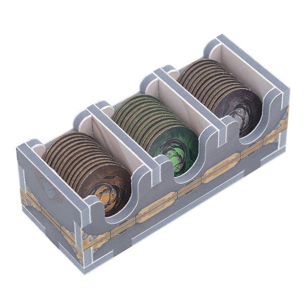 The design provides both efficient storage and improved game play. Many of the trays can be utilised during the game, and they greatly aid set-up and clear-away times. The rules and boards act as a lid on top of the trays. Note that the addition of the boards and track from the expansion will cause 5mm of lid lift.