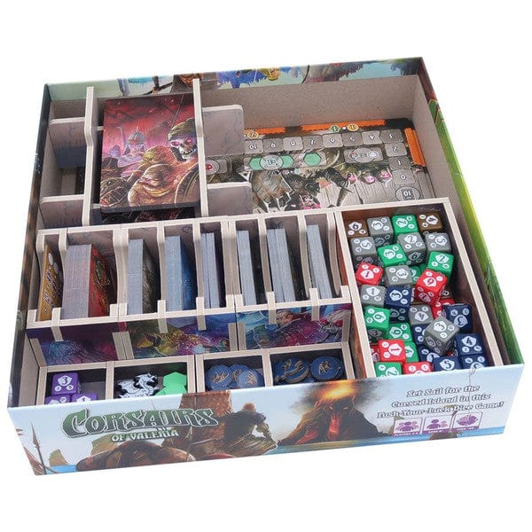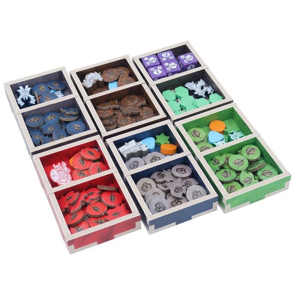 Official full colour insert compatible with Shadow Kingdoms of Valeria®, including space for the Rise of Titans® and Riftlands® expansions. The design provides both efficient storage and improved game play. Many of the trays can be utilised during the game, and they greatly aid set-up and clear-away times. The rules and boards act as a lid on top of the trays.