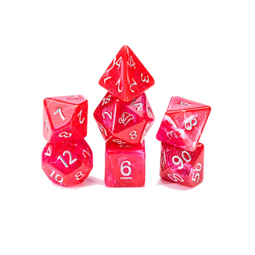This dice set looks, feels, and rolls well and will be a great addition to any game or collection. The top number is used on a roll. The edges allow for easy shape recognition and the numbers are about as large as possible on each face. Dice come in retail clamshell packaging. Each die measures approximately 16mm tall (measuring height while die is sitting flat). They are ~23mm measuring from point to point.