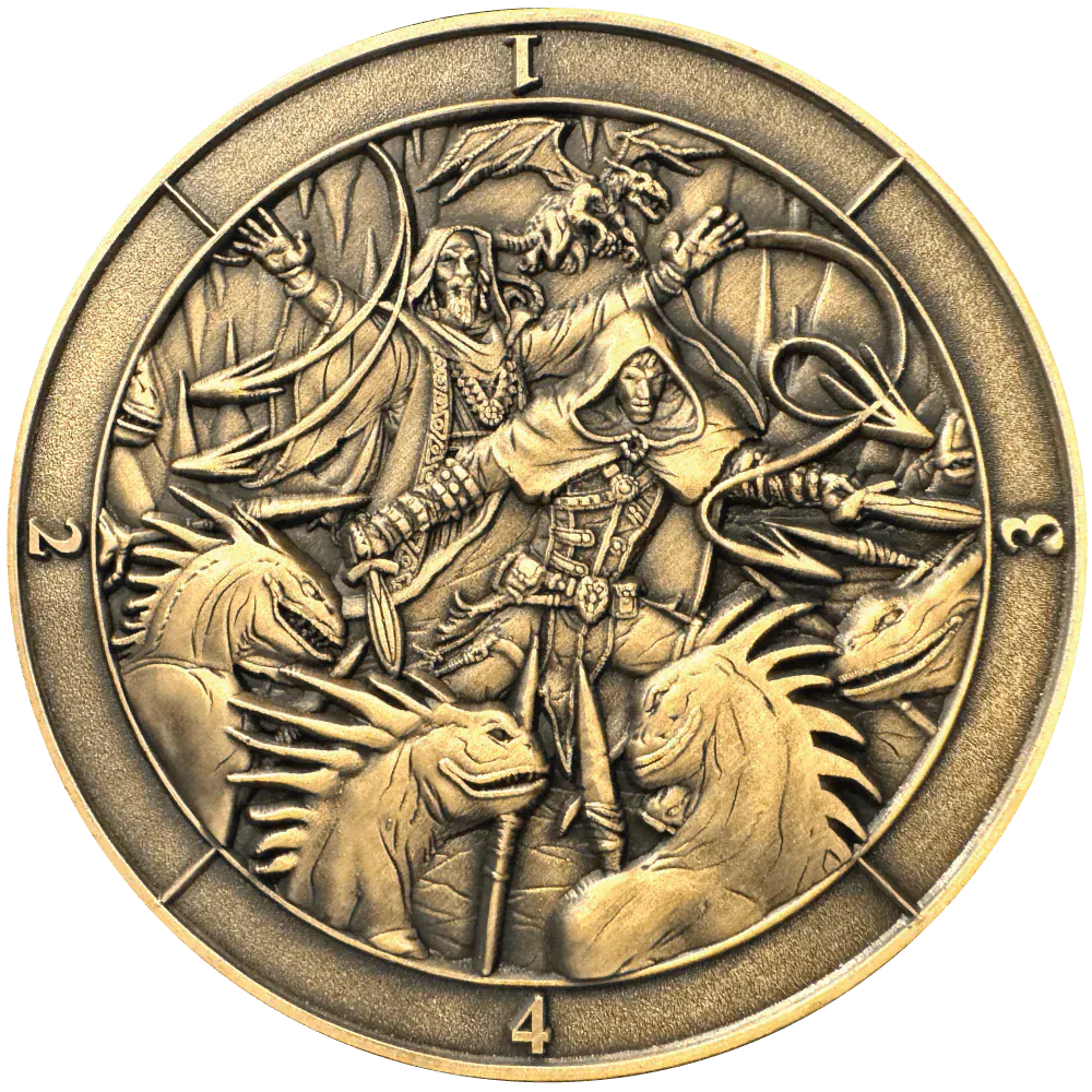 Goliath Coins are large display coins. They are incredibly detailed, metal coins that feature characters from pop culture, mythology, and gaming. The back has different art from the front and each one comes with a stand. Goliath Coins can be painted like any miniature. They can also be used as markers for turns, initiative, location, inspiration, or as game props.