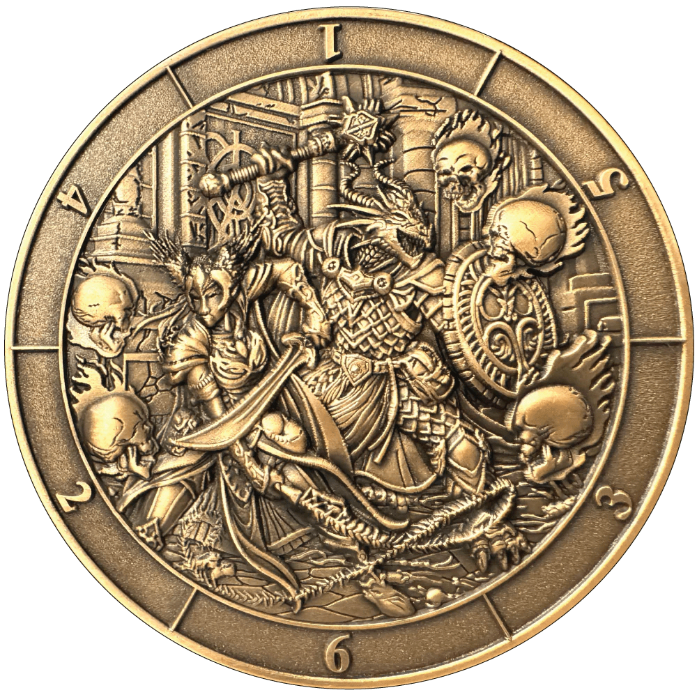 Fantasy battle scenes are depicted on the d4, d6, d8, d10, and d12 Dice Coins with art themed towards weapons that are used for that dice type.
