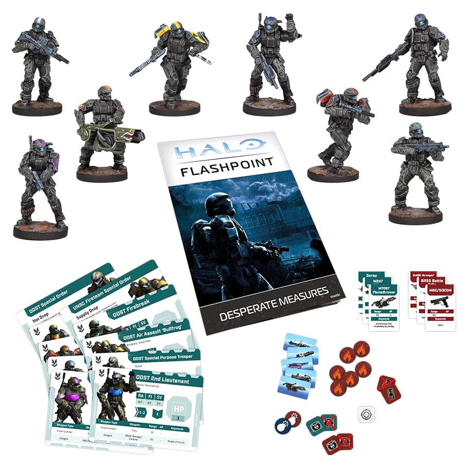 This expansion box for Halo Flashpoint contains the Desperate Measures Booklet, 8 ODST Miniatures, 10 x Unit Cards, 22 New Game Cards, and Gameplay Tokens.