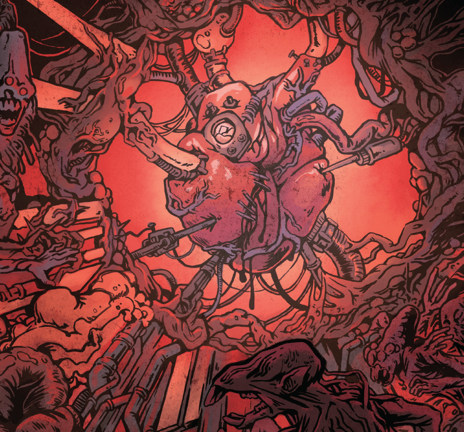 The Heart GM Screen is a gorgeous three-panel landscape screen. The player facing side depicts the sprawling vista of the Below, where the Delving Machine featured in Dagger in the Heart cuts through reality to reach the centre of the Heart.