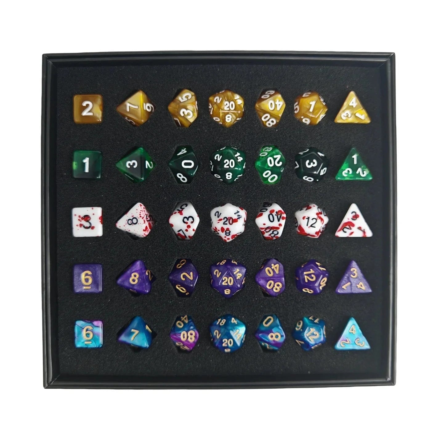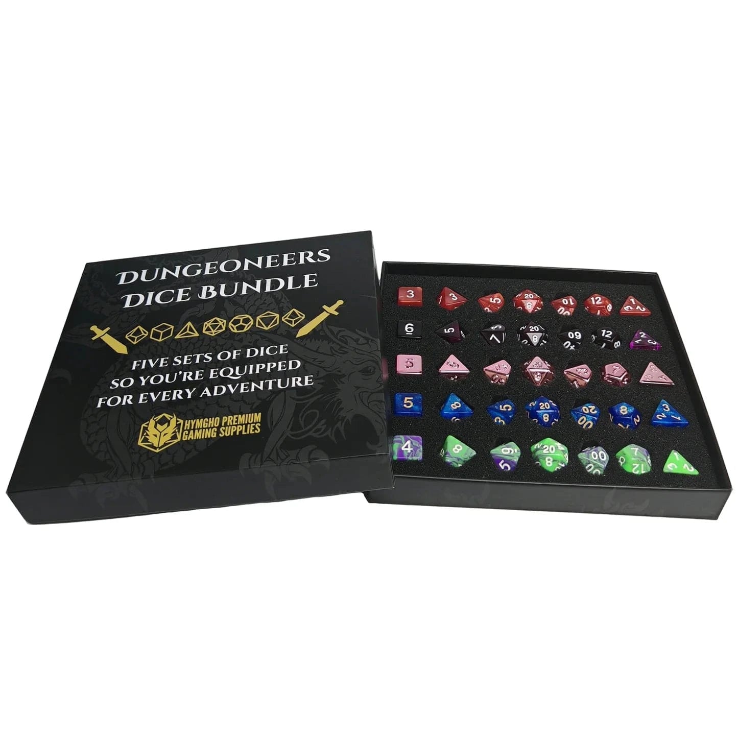 This exclusive Dungeoneers Dice Bundle contains five sets of random polymer dice, packed in a sealed HYMGHO brand paper box. Each set is meticulously crafted, and the colors will not repeat.