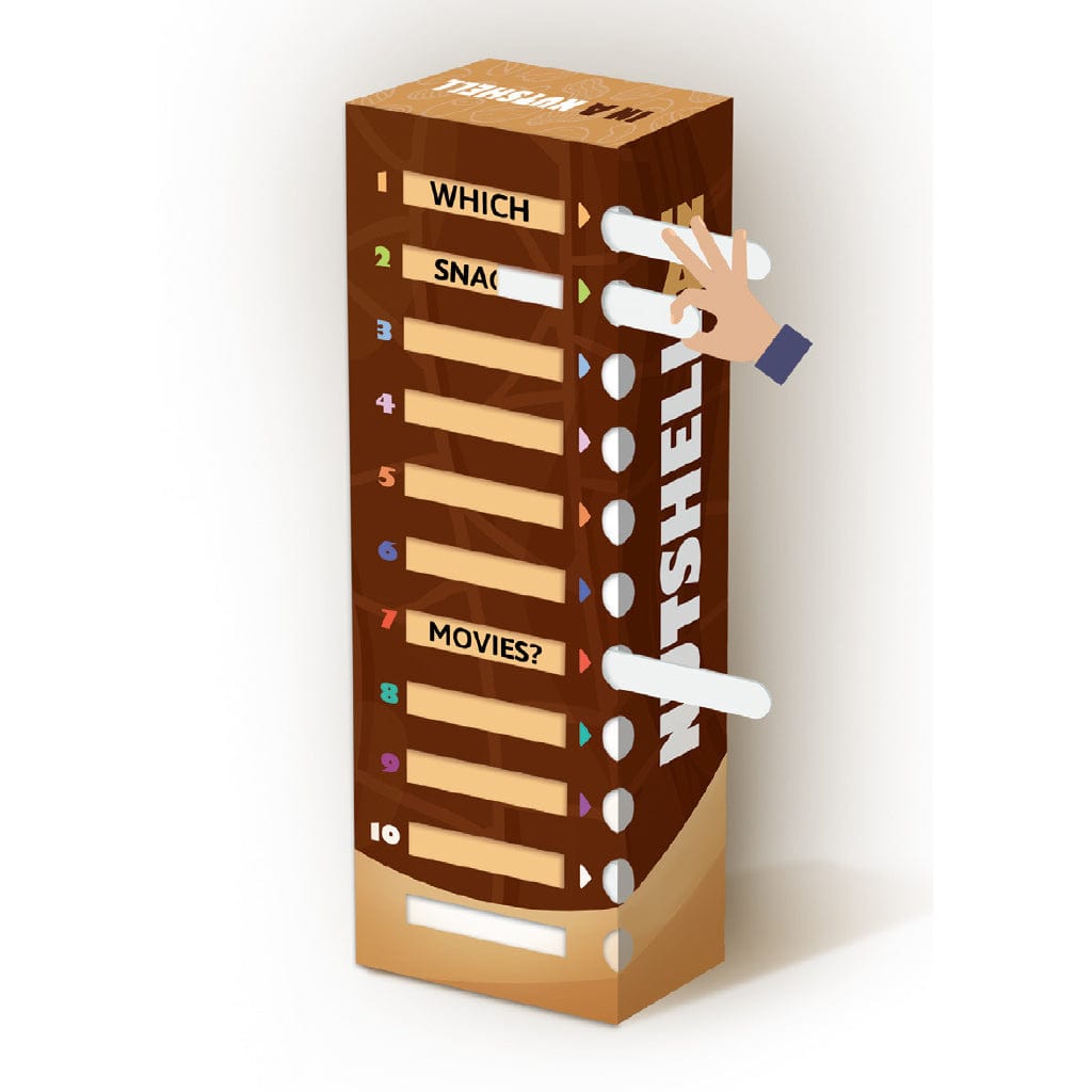 Can your team crack the nut? In a Nutshell is a family party game like no other, with its innovative box with sliding windows that reveal questions one word at a time. The challenge is to guess the answers by revealing the fewest possible words! Less is more - the fewer words you reveal, the more you score IF you get it right. How few will you risk? With two exciting game modes and over 450 questions, it's the ultimate word showdown that'll keep your team on the edge of their seats!