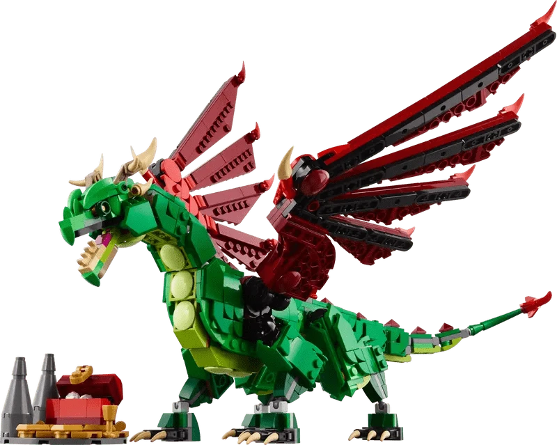 Delight your little time traveler with this LEGO® Creator Medieval Dragon (31161) creature toy playset. Featuring a dragon figure that lets boys and girls aged 9 and up role-play thrilling medieval action, it has a pair of large posable wings that move up and down and fold in and out, as well as posable ankles, toes, neck, jaw, hips and shoulders. It also comes with a treasure chest for added play value.