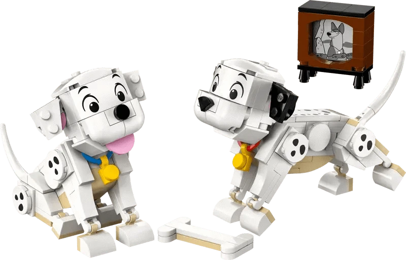- Dalmatian puppies everywhere – This kids’ building toy features Lucky and Penny LEGO® ǀ Disney characters from the classic movie 101 Dalmatians, plus a brick-built bone and a small TV with screen