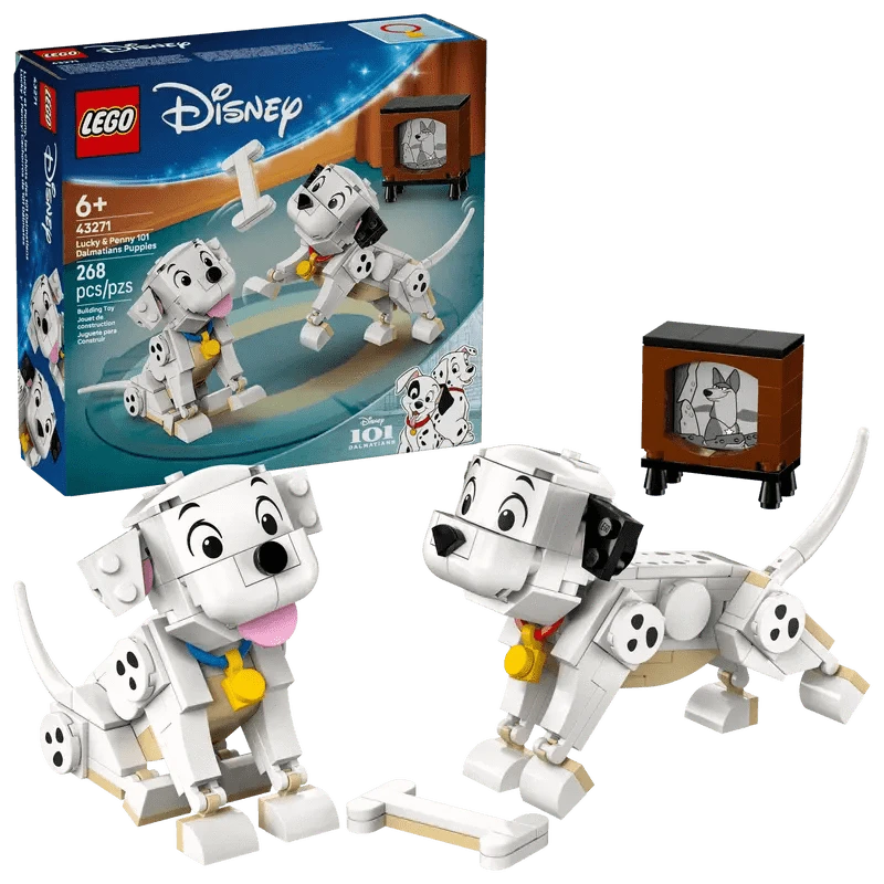 Thrill kids or animal fans aged 6 years and up with the Lucky & Penny 101 Dalmatians Puppies (43271) in this LEGO® ǀ Disney building toy. Packed with play options, the building toy includes 2 Dalmatian puppy characters from the Disney classic 101 Dalmatians, plus a brick-built toy bone and a small TV. The LEGO ǀ Disney puppy characters have movable heads, legs and tails, and can be posed in a variety of ways.
