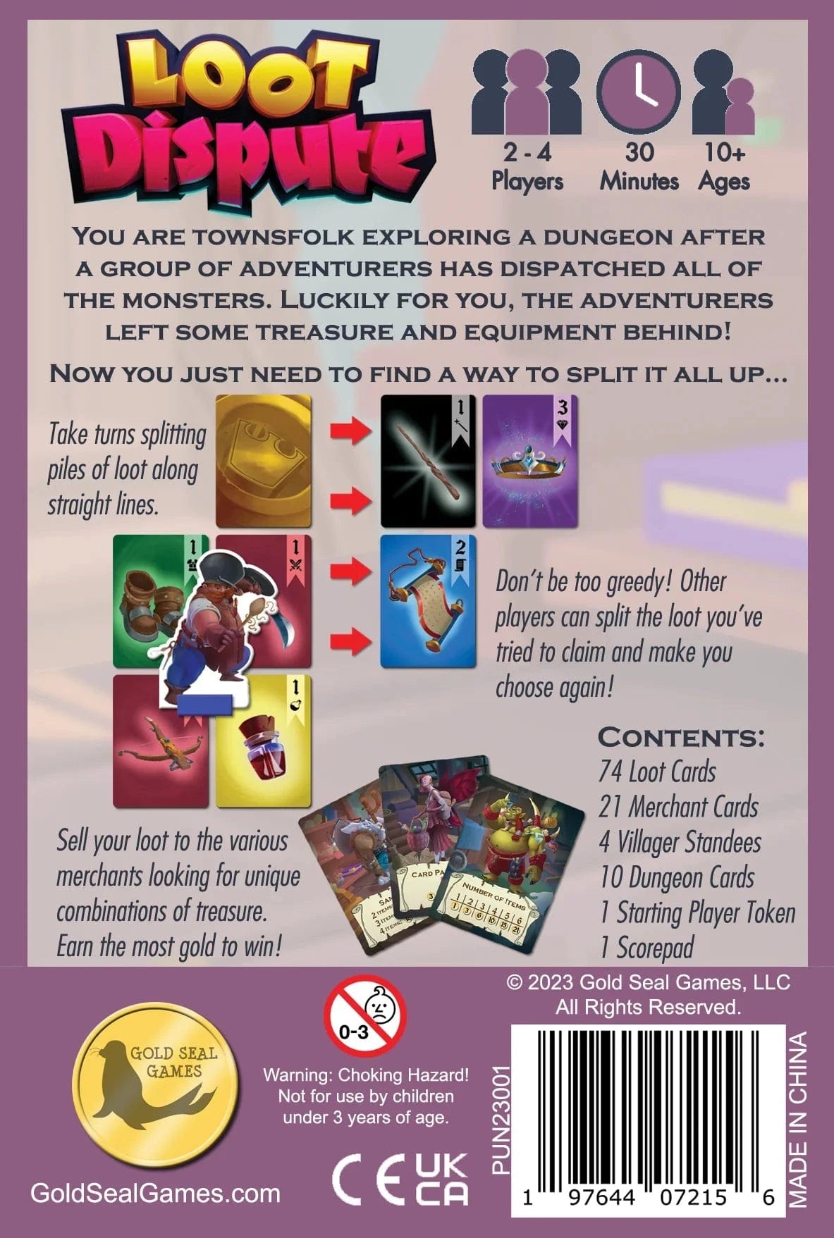 After 5 rooms of loot have been split, players score each color of loot based on the merchant assigned. Most points wins!