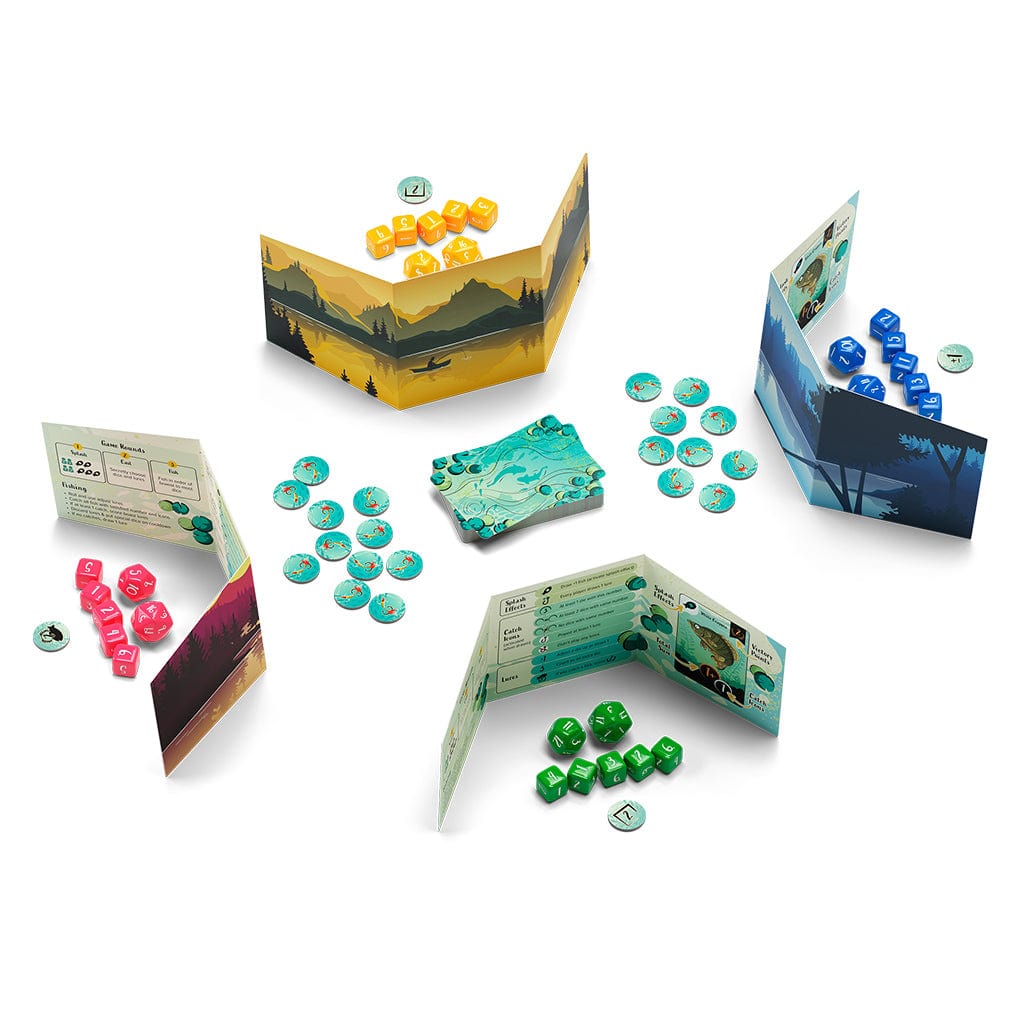 Players secretly bid on how many dice to use before the round starts. Bid less dice to go first, but use more dice to make it easier to catch. Most points wins after the deck of fish cards runs out!