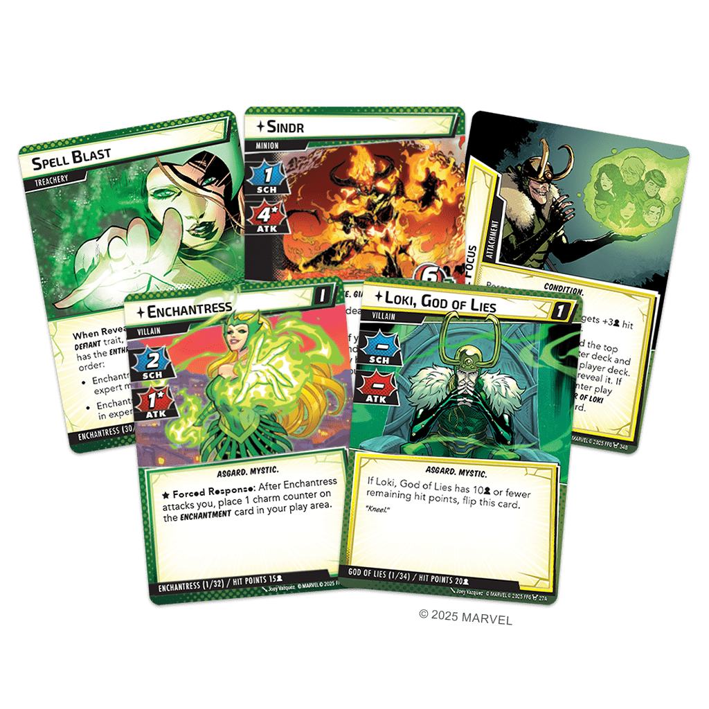 - A new Scenario Pack for Marvel Champions: The Card Game featuring Enchantress and Loki, two trickster villains with powerful magic at their command.