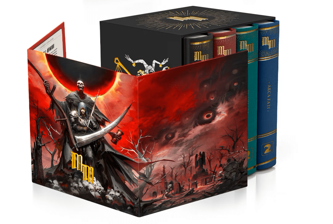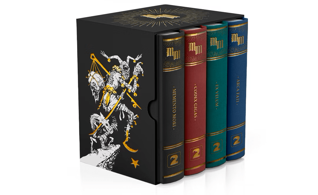 This slipcase holds the 3 Memento Mori books, the Corebook, the Codex giga and the Ex Velum along with the Arca Fati box. The front is a detachable 3-panel Narrator Screen that features summary tables for all the main game rules.