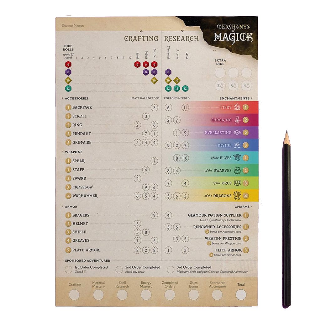 100 Player Sheets 56 Order Cards 8 Sponsored Adventurers 6 Mastery Cards 30 Potion Tokens 4 Dice (D6, D8, D10, D12) 4 Pencils 1 Rulebook