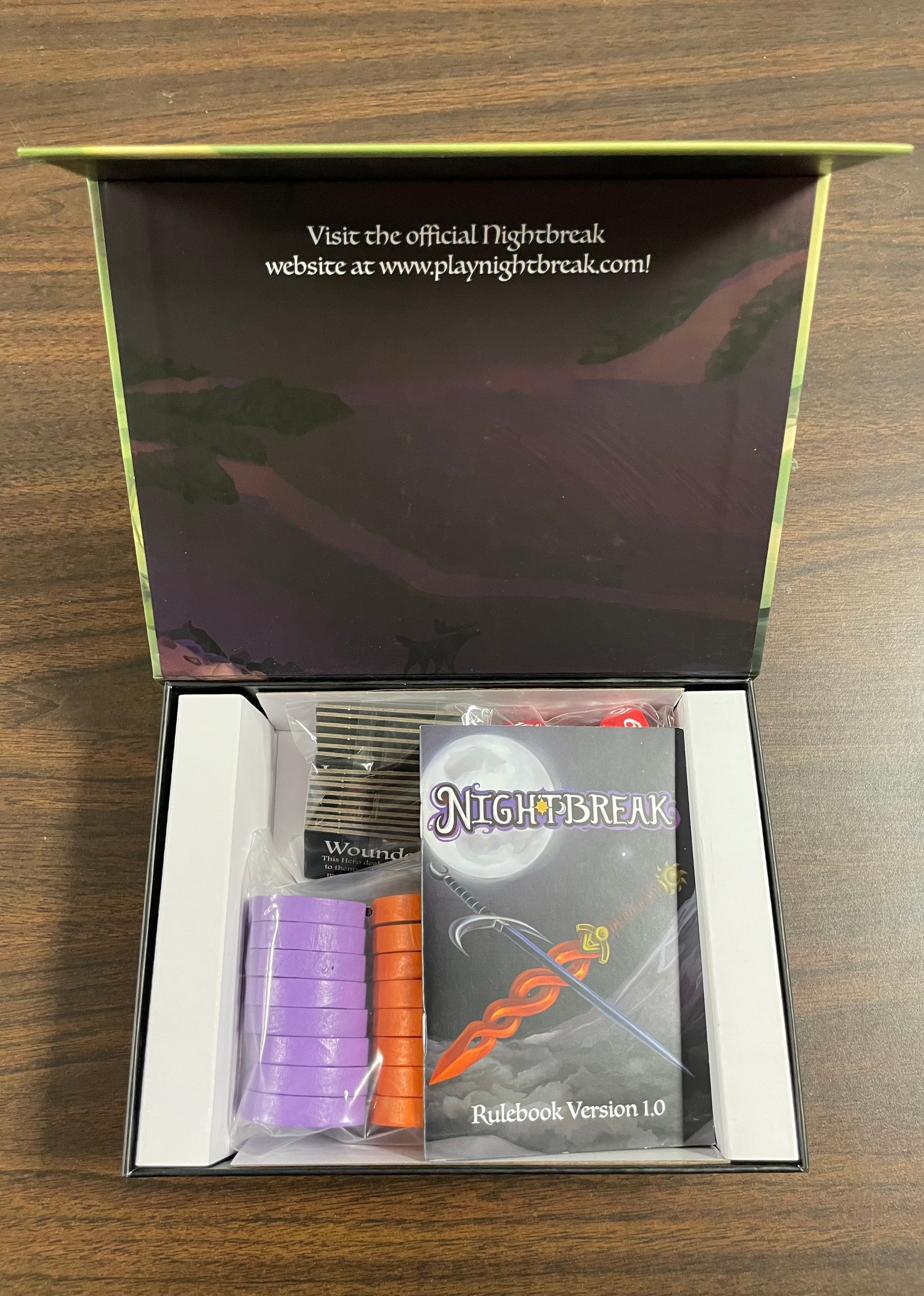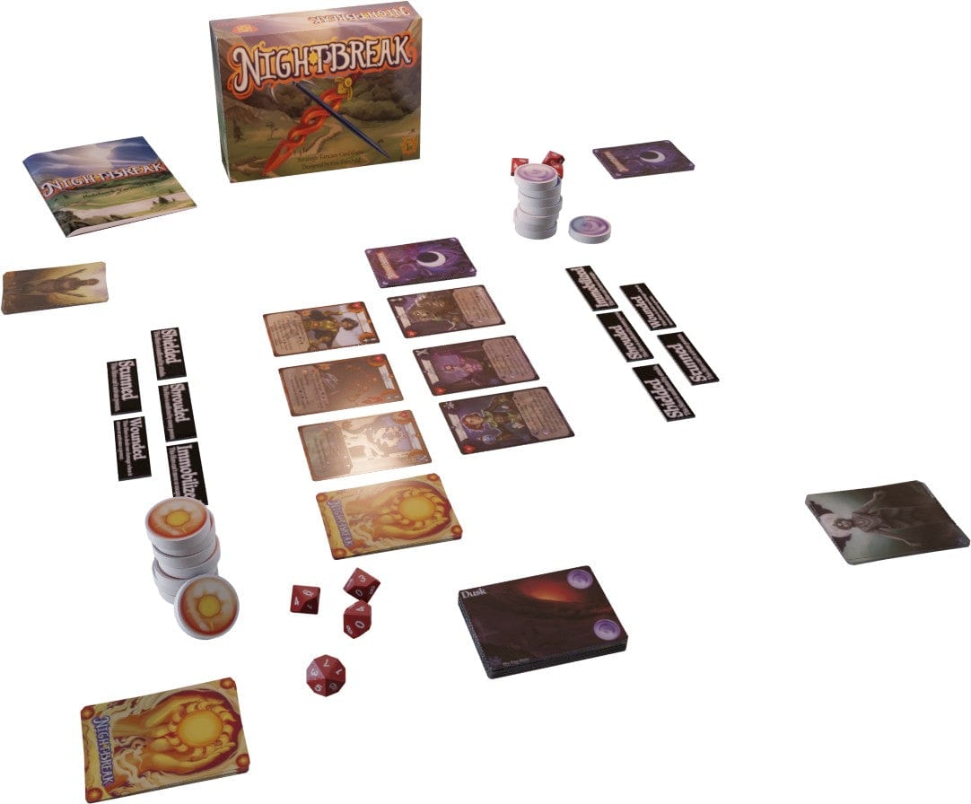 Nightbreak is a medium weight competitive hero-based fantasy card game that features a fixed turn count, a day/night resource system, spatial positioning mechanics, and push your luck mechanics.