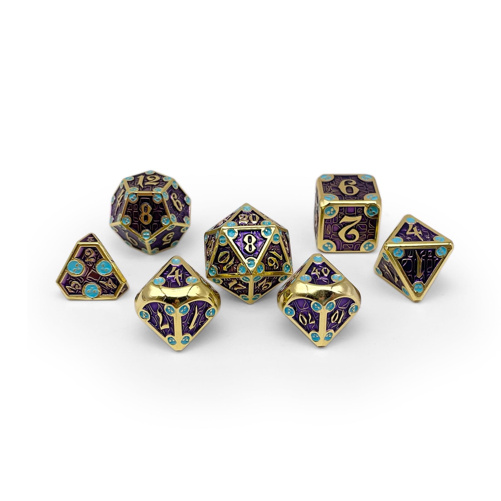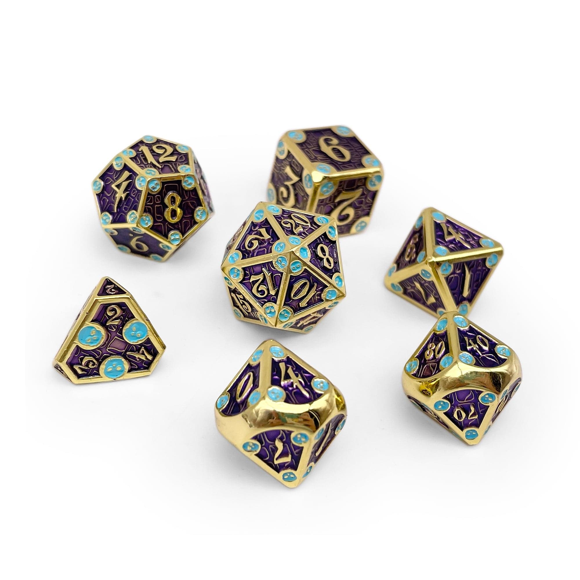 An Adventure Awaits. On a quest ordained by the royal decree, your sworn paladin has the singular goal of success. The kingdom and the fate of the royal crown depend on it. On the front lines of the battle with hordes of undead critters and creeps charging with fiendish delight, the shield welding warrior needs a special set of moves to defend, attack, and reign victorious. This 7-Piece RPG Dice Set equips your character with the power to avoid misfortune, tricks, and traps while strengthening their ability to accomplish any mission they are on. The distinct design features precise patterns accented with gold over purple enamel and complemented by blue skull accents. Round-edged and luxurious, this dice set is a keeper. Enhance your Dungeons Crawling Experience. Each set has a brilliant dungeon floor design underneath an enamel overlay. These premium metal dice features come with a Norse Foundry tin for protecting your dice when you are not using them. Durable Material. Made from solid zinc alloy. They are strong, solid and ready for the challenge of any adventure. Each piece is meticulously designed to create a unique dungeon crawling experience. 7-Piece Set. Set includes 7 polyhedral dice (d20, d12, 2x d10 (00-90 and 0-9), d8, d6, and d4) Start Your Adventure. Great for all role-playing (RPG) games including Dungeons and Dragons, Pathfinder, Savage Worlds, GURPS, Hackmaster, and more. Material: Zinc Alloy Skull Fill: Light Blue Color: Gold, Purple, and Blue Number Fill: Gold