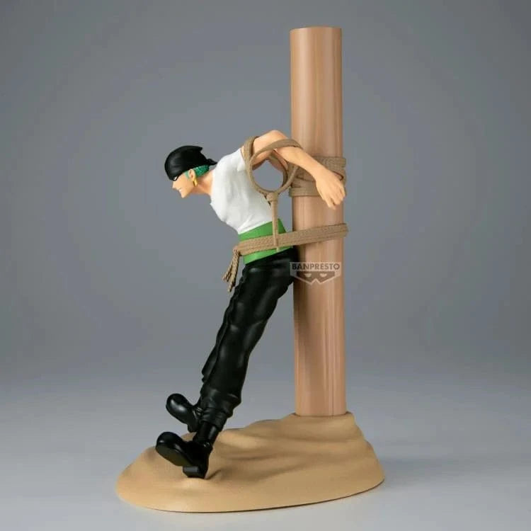 Banpresto is setting sail in search of the One Piece and has picked up a new crewmate to join in the adventure: the swordsman of the Straw Hat Pirates, Roronoa Zoro! Depicted tied to a mast in preparation of being executed for saving a little girl from a corrupted captain's pet wolf, Zoro nevertheless has a determined grin on his face as he faces down the Marines. Don't miss out on growing your One Piece collection and add this awesome figure to your collection today!