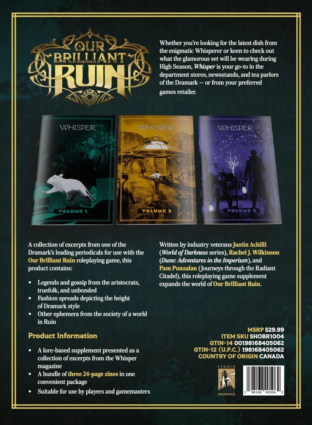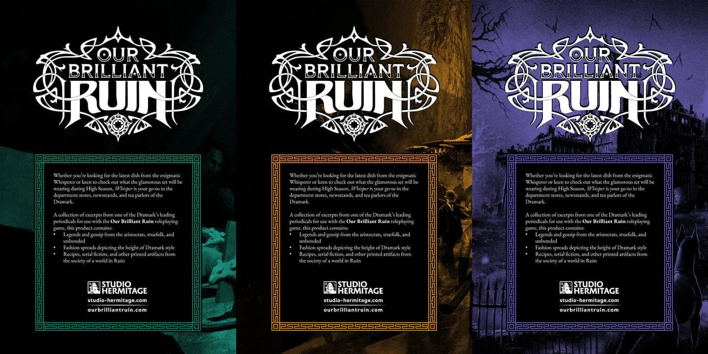 Whether you’re looking for the latest dish from the enigmatic Whisperer or keen to check out what the glamorous set will be wearing during High Season, Whisper is your go-to in the department stores, newsstands, and tea parlors of the Dramark — or from your preferred games retailer. A collection of excerpts from one of the Dramark’s leading periodicals for use with the Our Brilliant Ruin roleplaying game. This pack contains three volumes printed in paperback format that add depth and worldbuilding to the world of Our Brilliant Ruin.