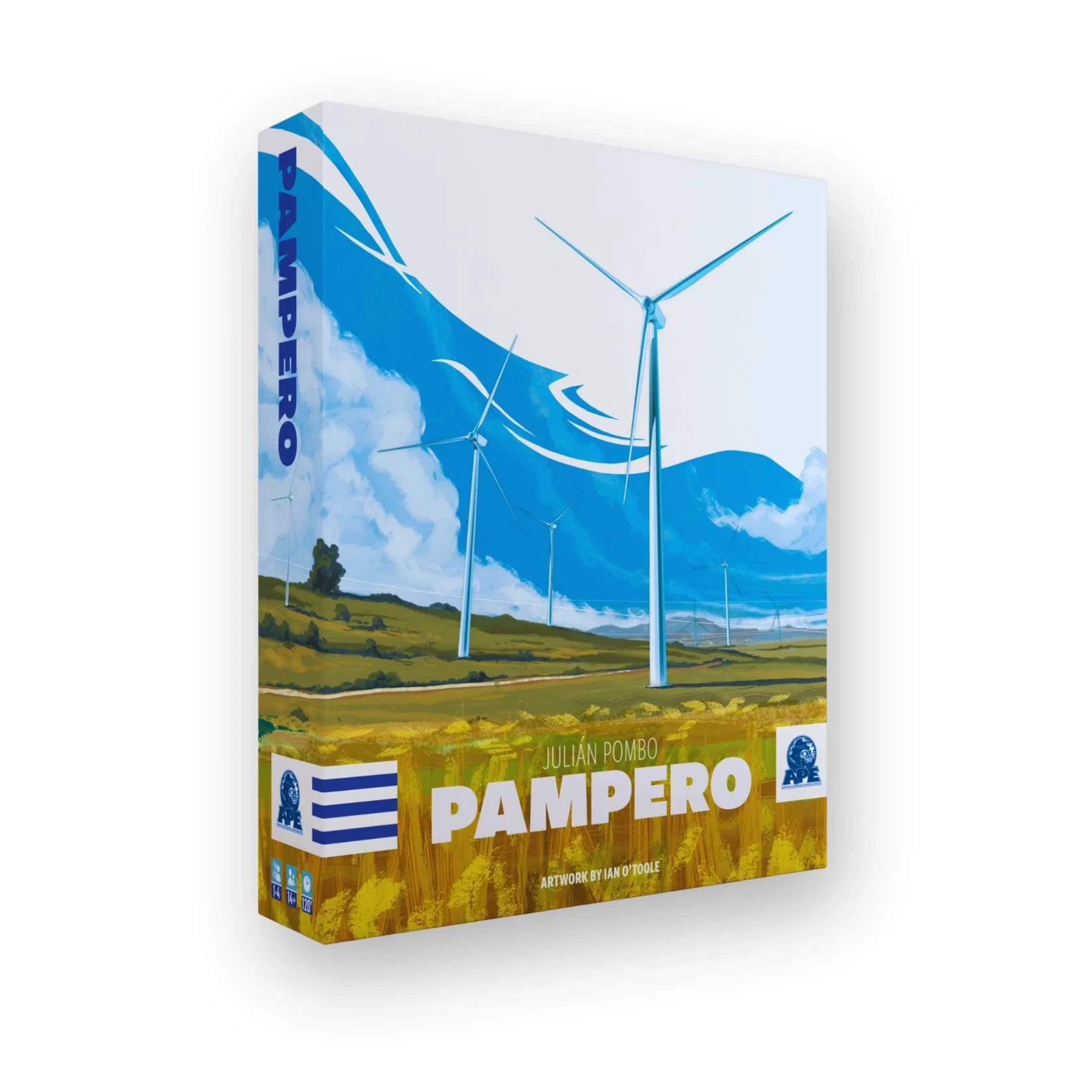 Pampero is a hand-management, card-driven action-selection game. Every player has a starting set of eight cards to be played on their own tableau, which contains two rows of spaces to activate actions on the different sectors of the board. Each turn, you have the option to play a card to the leftmost empty space of either row or to retrieve all cards from your tableau. After three actions, a special phase takes place — consolidation, during which you retrieve the rightmost card from any row, generate batteries from stored energy, collect income, and advance the game timer. The player with the most money at the end of the game wins.