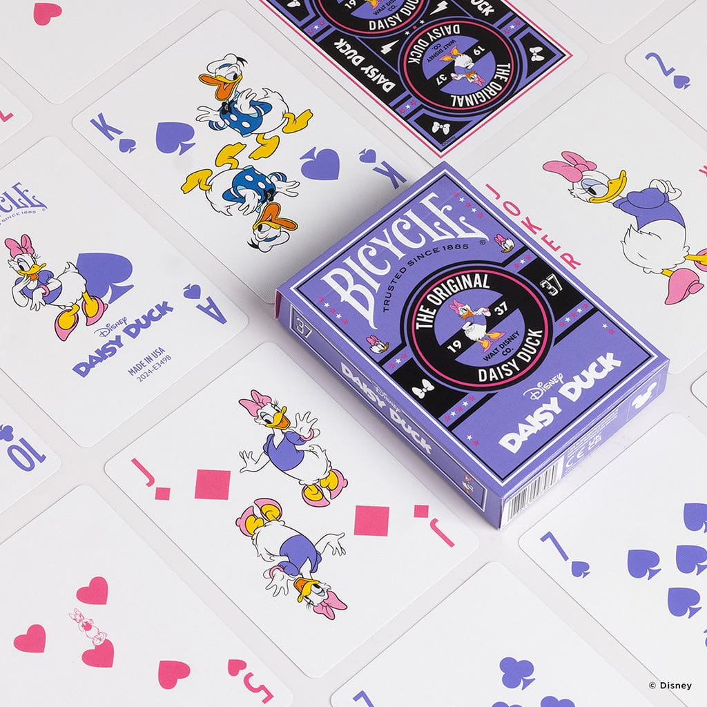 "Gather your girlfriends for an enchanting game night with Disney Classic Daisy Duck Inspired Playing Cards by Bicycle! Featuring Daisy Duck's elegance, the lovely lavender spot varnished tuck box pays homage to