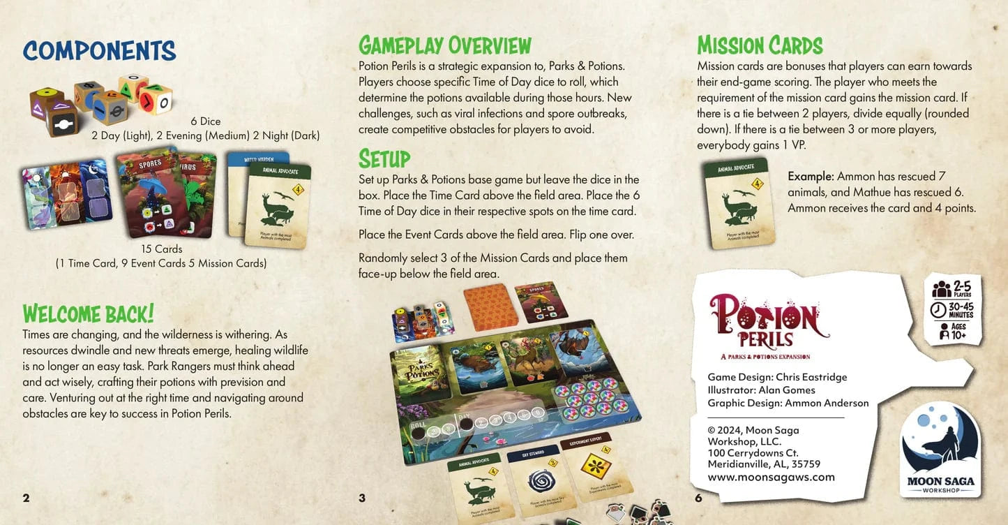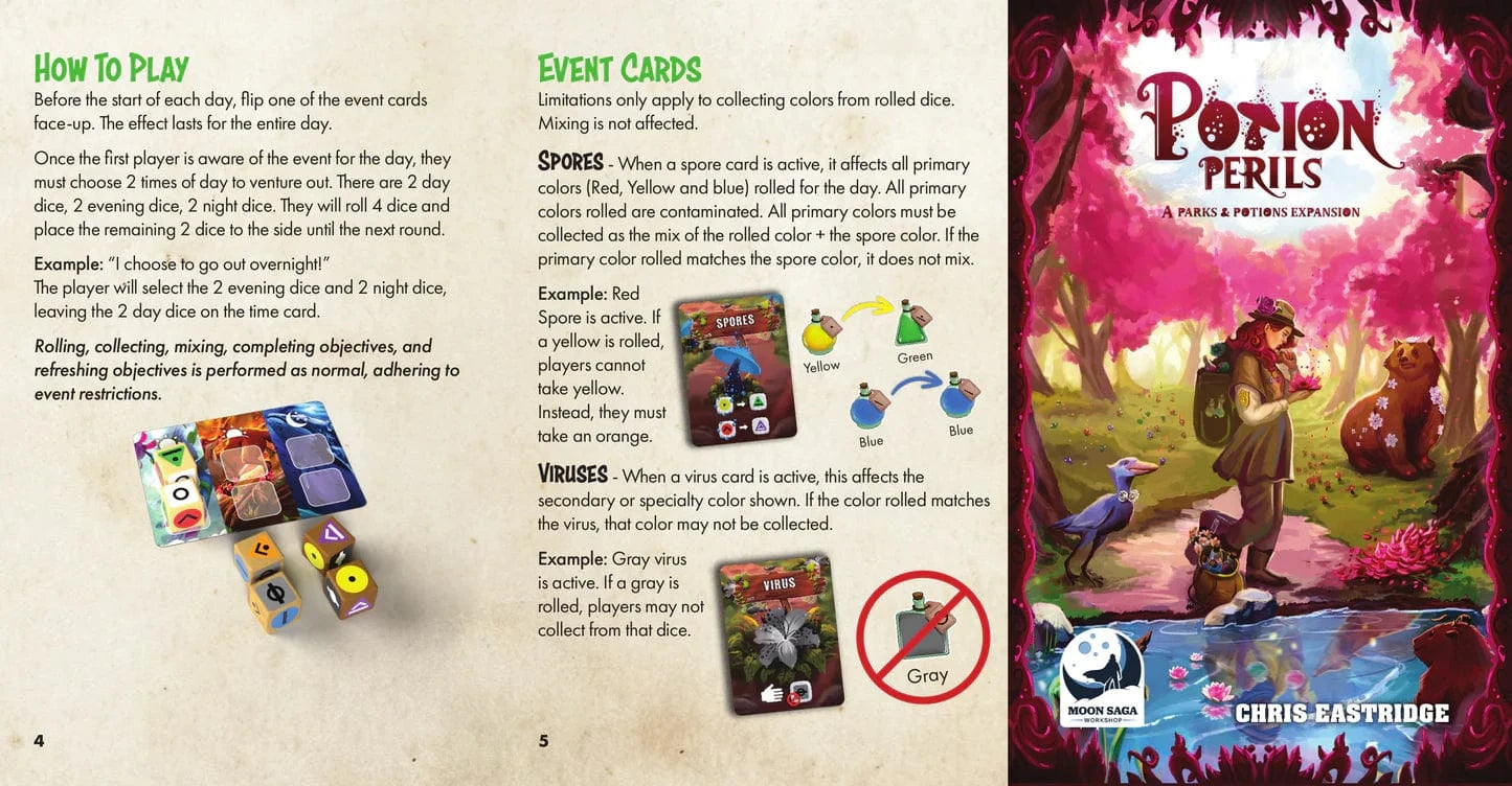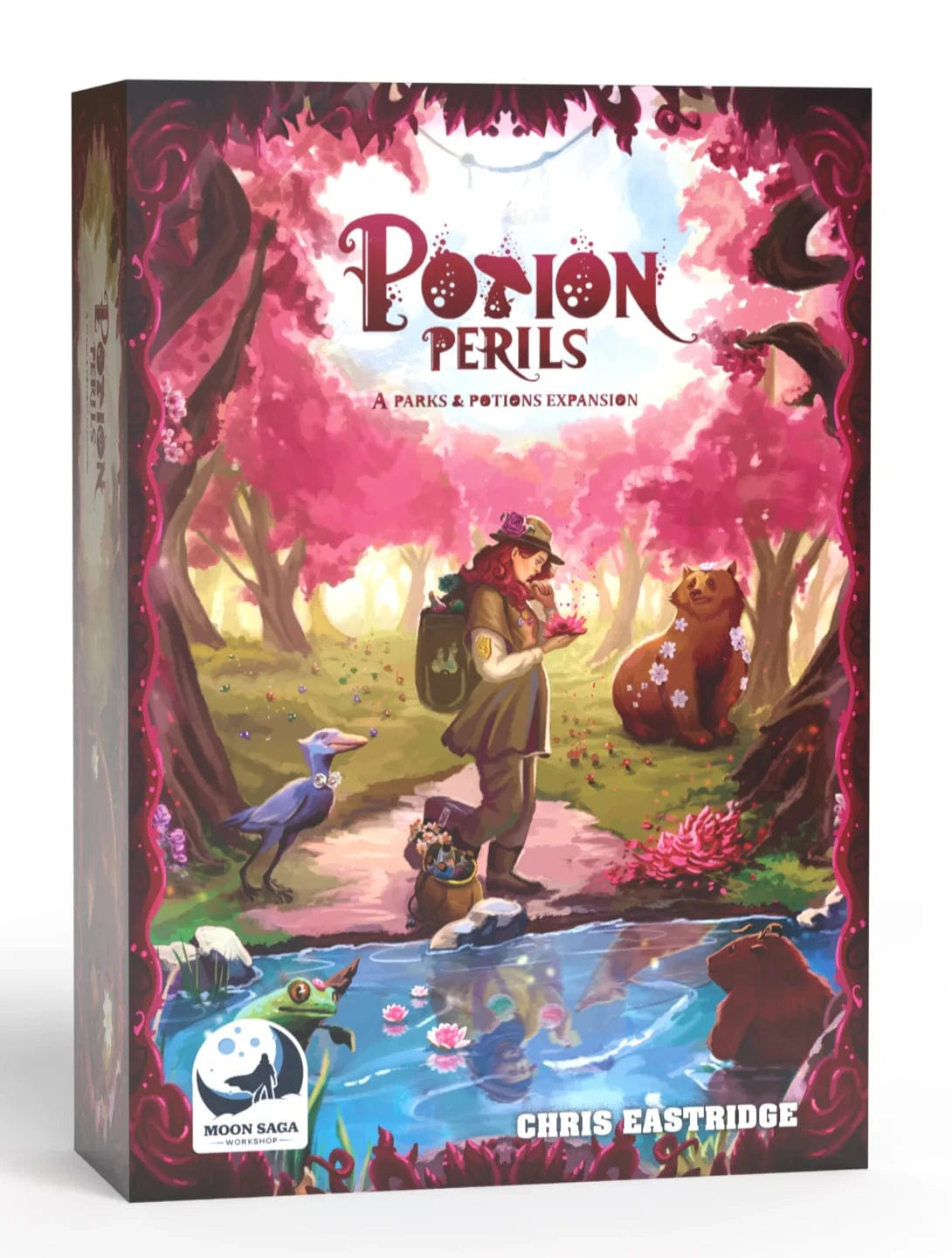 Potion Perils is a strategic expansion that requires the base game, Parks & Potions. In this expansion, players choose specific Time of Day dice to roll, which determine the potions available during those hours. New challenges, such as viral infections and spore outbreaks, create competitive obstacles that players must navigate each round.