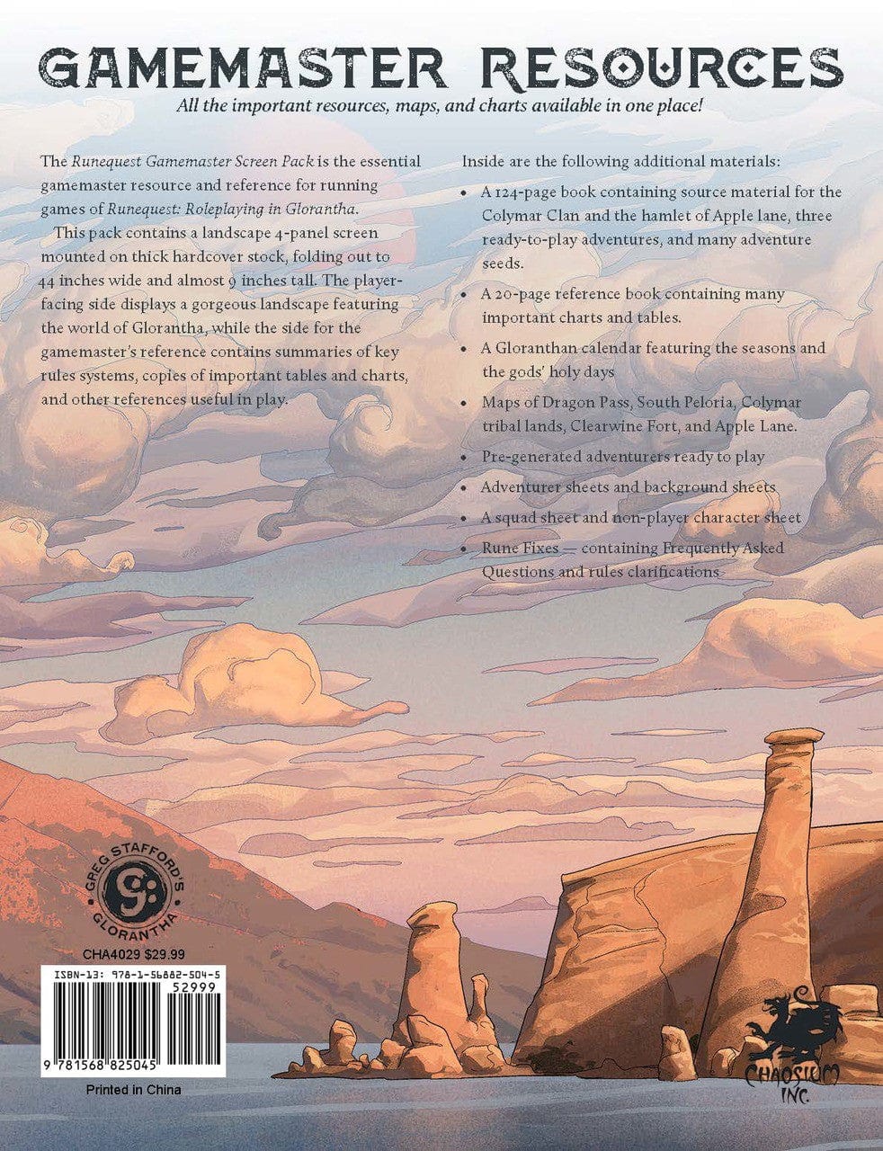 The RuneQuest Gamemaster Screen Pack is an essential play aid for gamemasters of RuneQuest: Roleplaying in Glorantha. The gamemaster screen itself is a landscape four-panel screen, 34-inches wide, with a gorgeous illustration of the famed Gods Wall facing the players, and all manner of important references and summaries of key rules on the gamemasters side. Included with the screen is a 96-page Adventures Book with three ready-to-play scenarios set in Apple Lane, a small village beset with problems, along with seven ready-to-play adventurer characters. Apple Lanes residents and surroundings are described in detail, making it a perfect location for gamemasters to begin RuneQuest campaigns in.