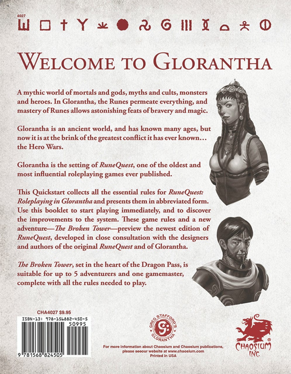 Enter a mythic world of mortals and gods, myths and cults, monsters and heroes! In Glorantha, the Runes permeate everything, and mastery of Runes allows astonishing feats of bravery and magic. Glorantha is an ancient world, and has known many ages, but now it`s at the brink of the greatest conflict it has ever known - the Hero Wars! This Quickstart booklet collects all the essential rules in abbreviated form for RuneQuest: Roleplaying in Glorantha and includes a new, introductory adventure (`The Broken Tower`).