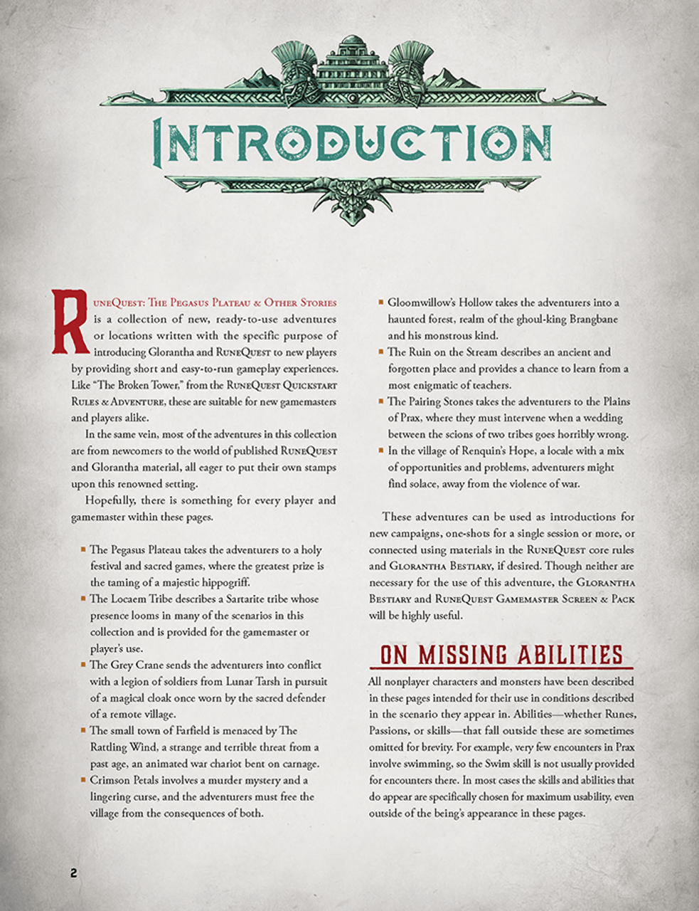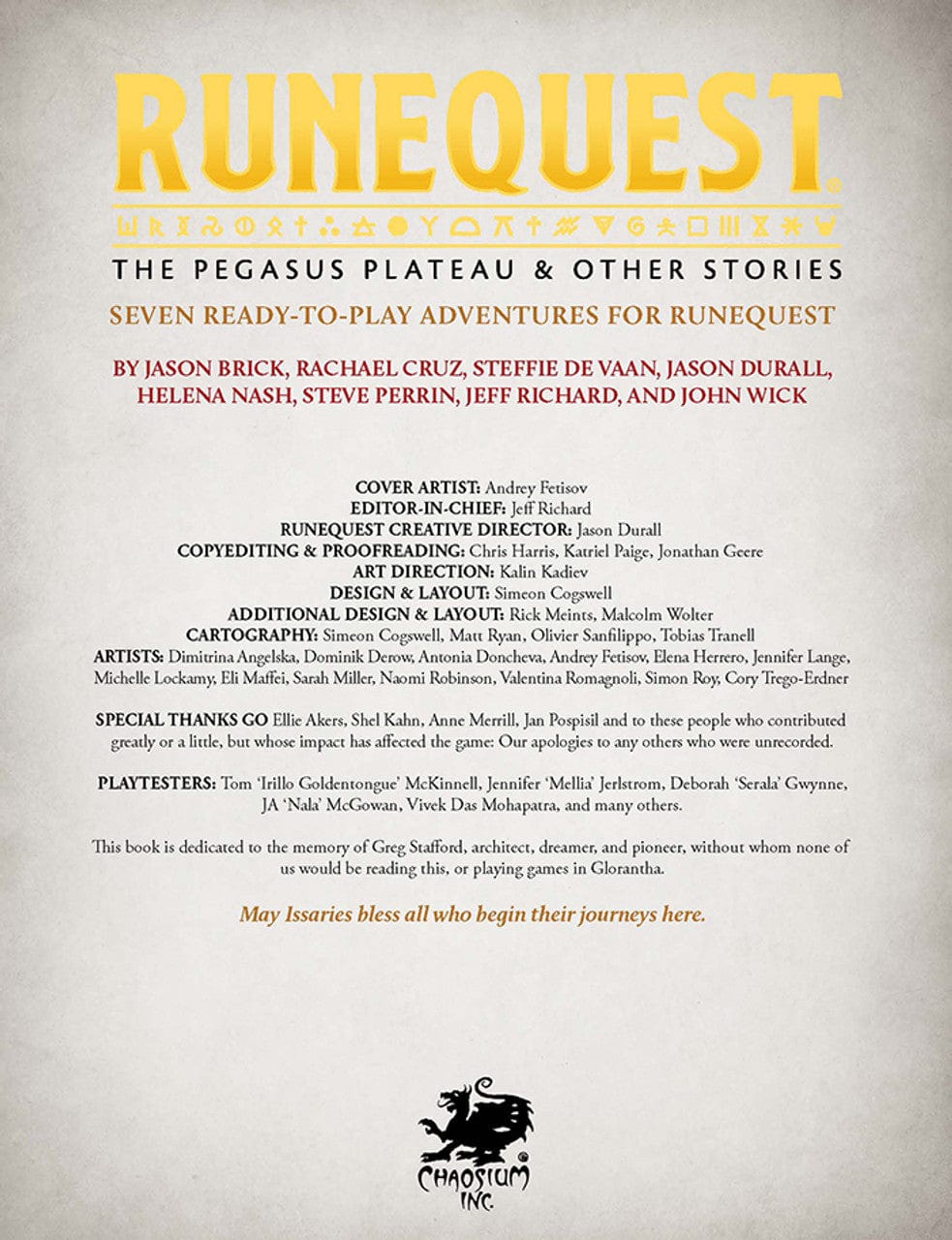 The Pegasus Plateau & Other Stories is a collection of new, ready-to-use adventures or locations written with the specific purpose of introducing Glorantha and RuneQuest to new players by providing short and easy-to-run gameplay experiences. Like The Broken Tower from the RuneQuest Quickstart Rules & Adventure, these are suitable for new gamesters and layers alike. In the same vein, most of the adventures in this collection are from newcomers to the world of published RuneQuest and Glorantha material, all eager to put their own stamps upon this renowned setting.