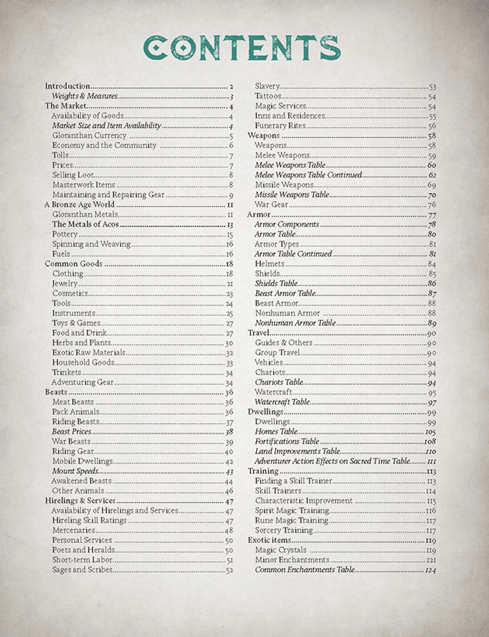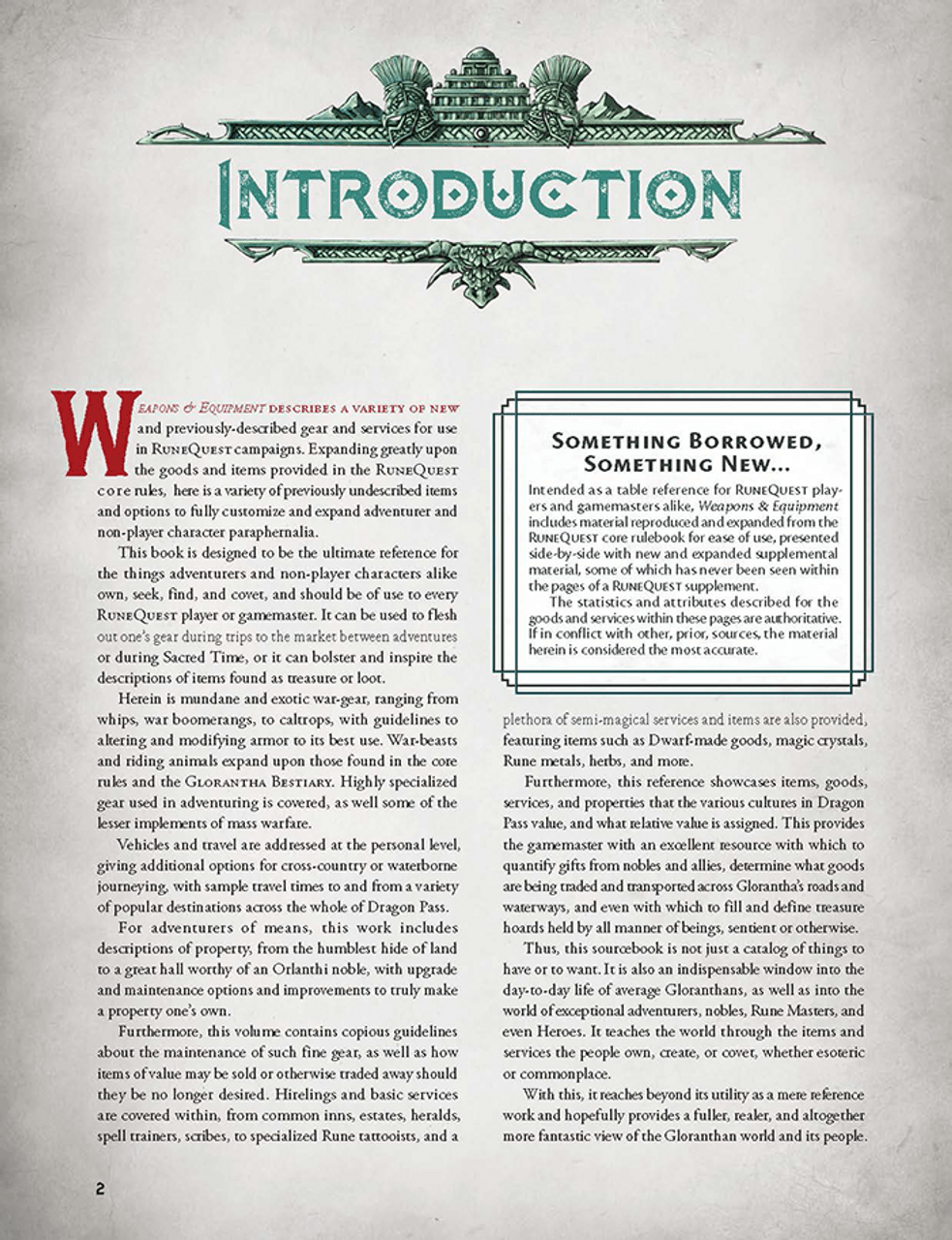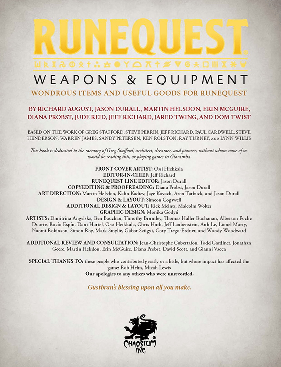 An essential reference guide for RuneQuest players, Weapons & Equipment showcases Gloranthan culture and life, describing the items and services adventurers use everyday, exceptional and magic items, as well as how they can sell their hard-won treasure. Weapons & Equipment dramatically expands the RuneQuest core rules, with new means of equipping and advancing your adventurers, Gamemasters can use these contents for treasure hoards and other material rewards, making this an invaluable resource for every RuneQuest player.