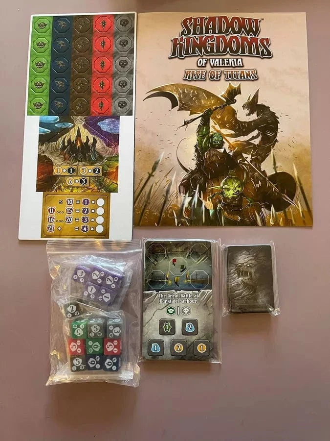 Introduction: This expansion includes four modules: Shrine of the Titans, Great Battles, Ancient Spells, and Wraith Dice. You may play with one or more modules, mixing and matching as you please. Modules can all be included in a game of Shadow Kingdoms of Valeria, though we recommend that you have a firm understanding of the base game and each module before including them all at once.