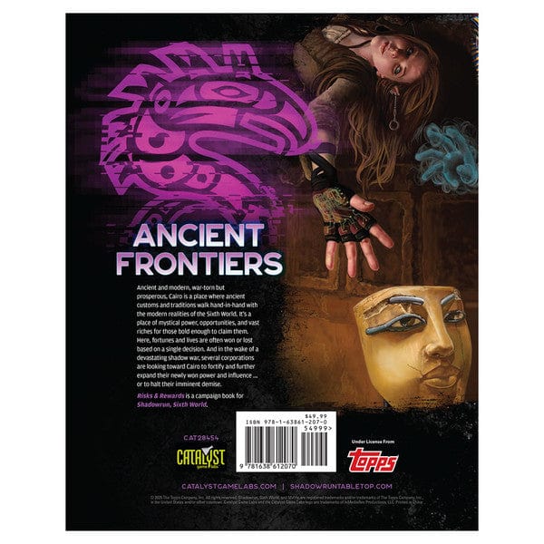 The Sixth World is full of great cities to stage a campaign, and Risks and Rewards brings players to Cairo for corporate espionage-heavy campaigns. They`ll discover trade secrets, help shift the balance of power in the area, and try to keep one step ahead of their adversaries. With details about the city and a compelling plotline, this book provides a campaign structure for any Shadowrun group.